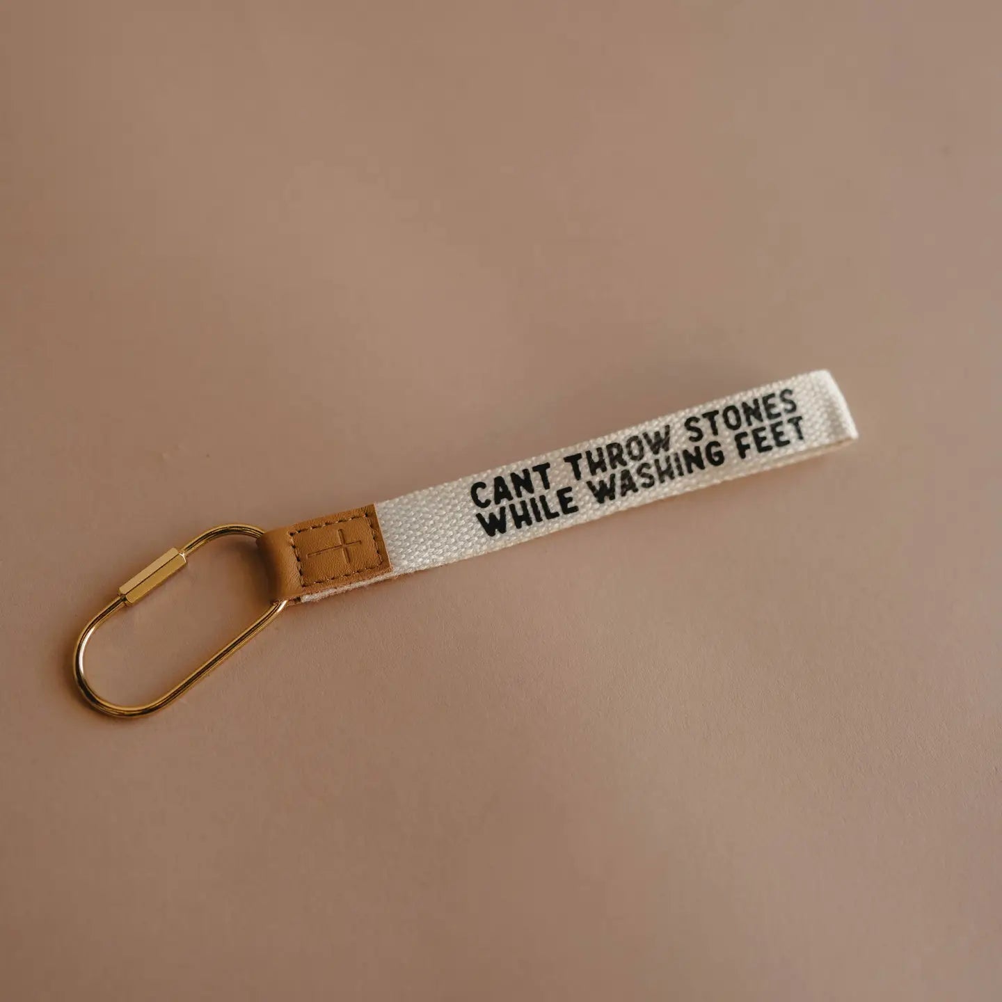 -"Can't throw stones while washing feet" printed on fabric.