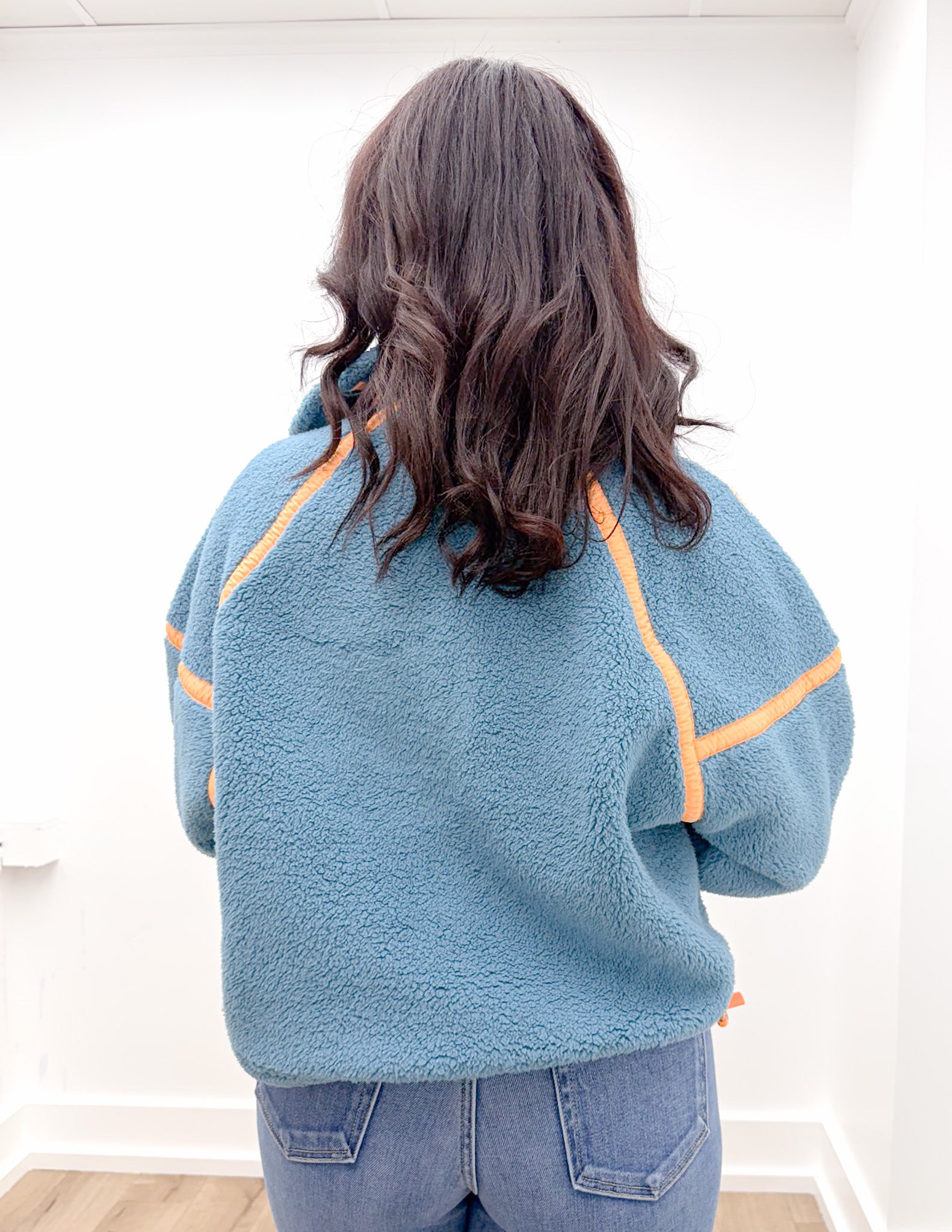 Cozy fleece pullover featuring a half-zip closure and high neckline with bold contrast seams throughout and an adjustable hemline.