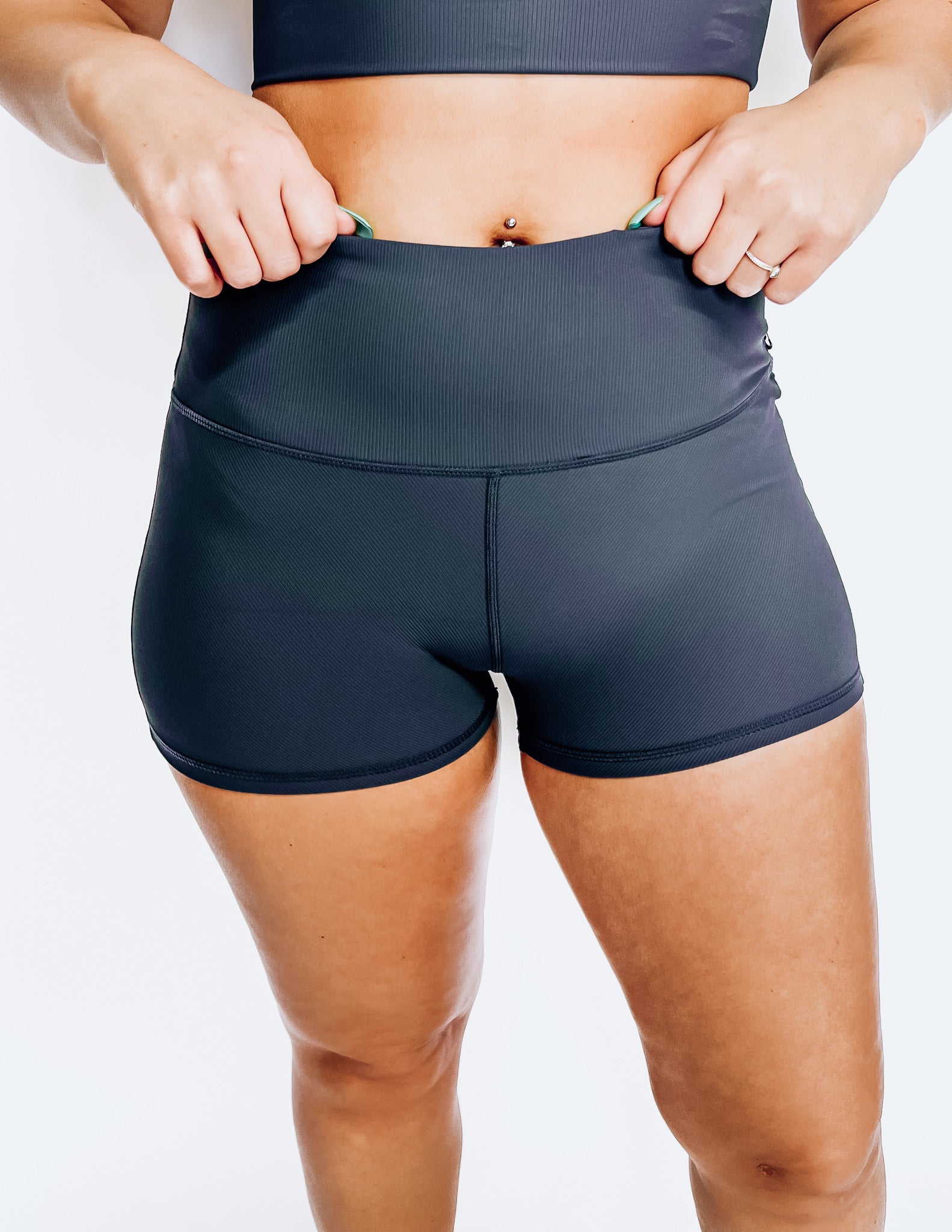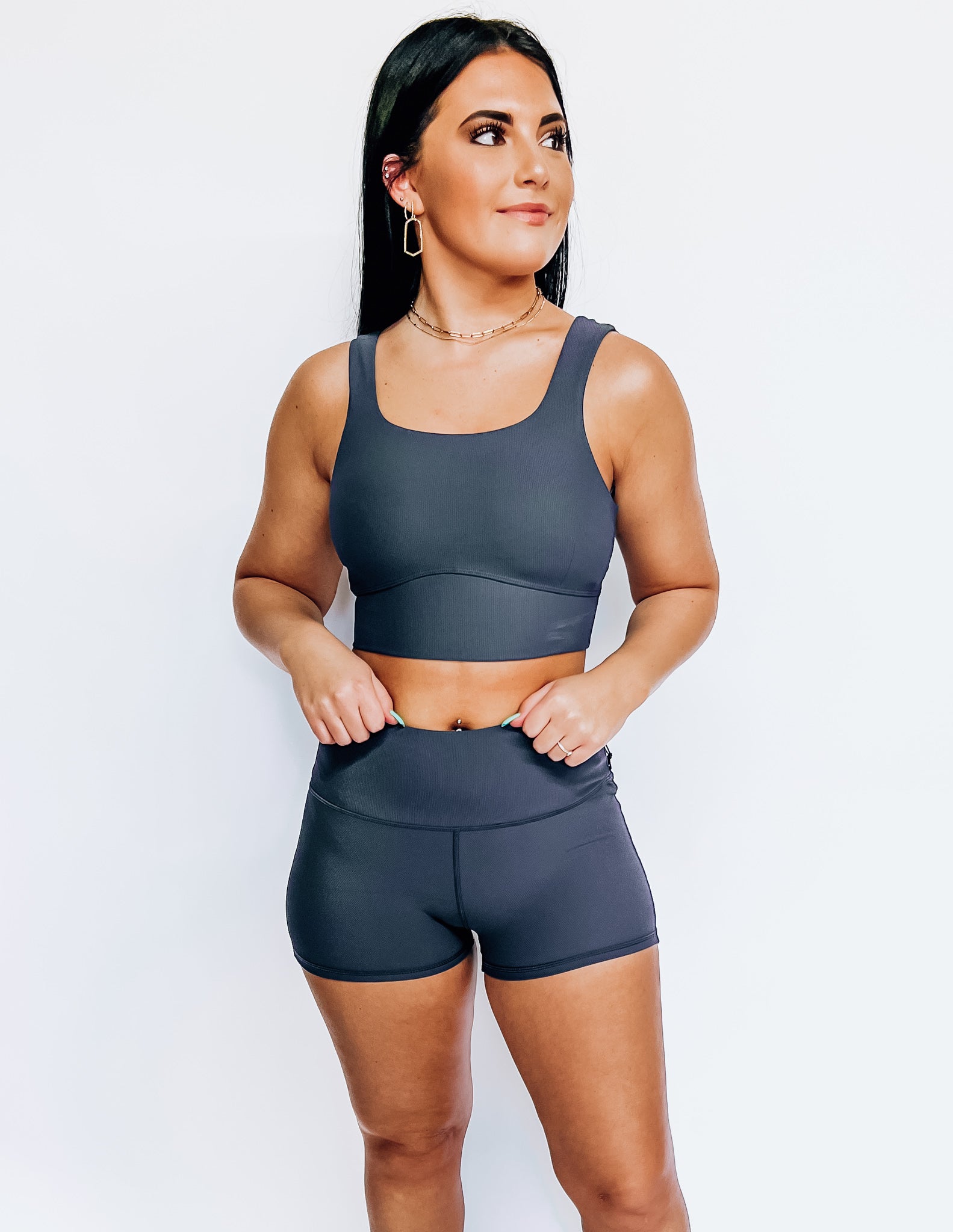 We updated the classic sports bra by constructing it with a solid, performance-level fabric with a micro-ribbed texture. The wide hemline that curves in the center front creates a flattering silhouette. 79% nylon, 21% Lycra®. Tummy-control.