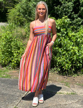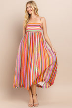 Abstract striped midi dress, with adjustable spaghetti straps.