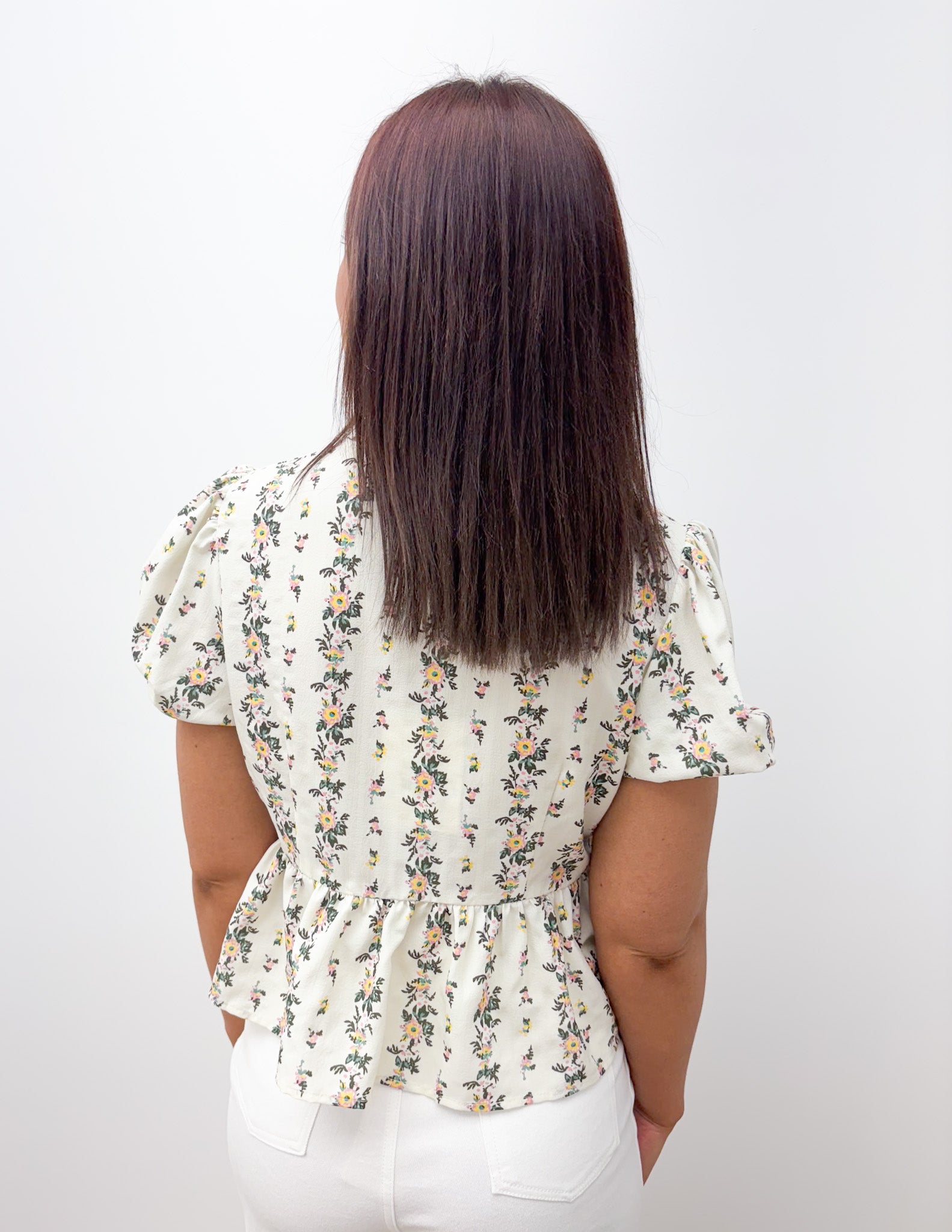 FLORAL PRINT TIE FRONT SHIRRED HEM BLOUSE TOP WITH PUFF SLEEVE