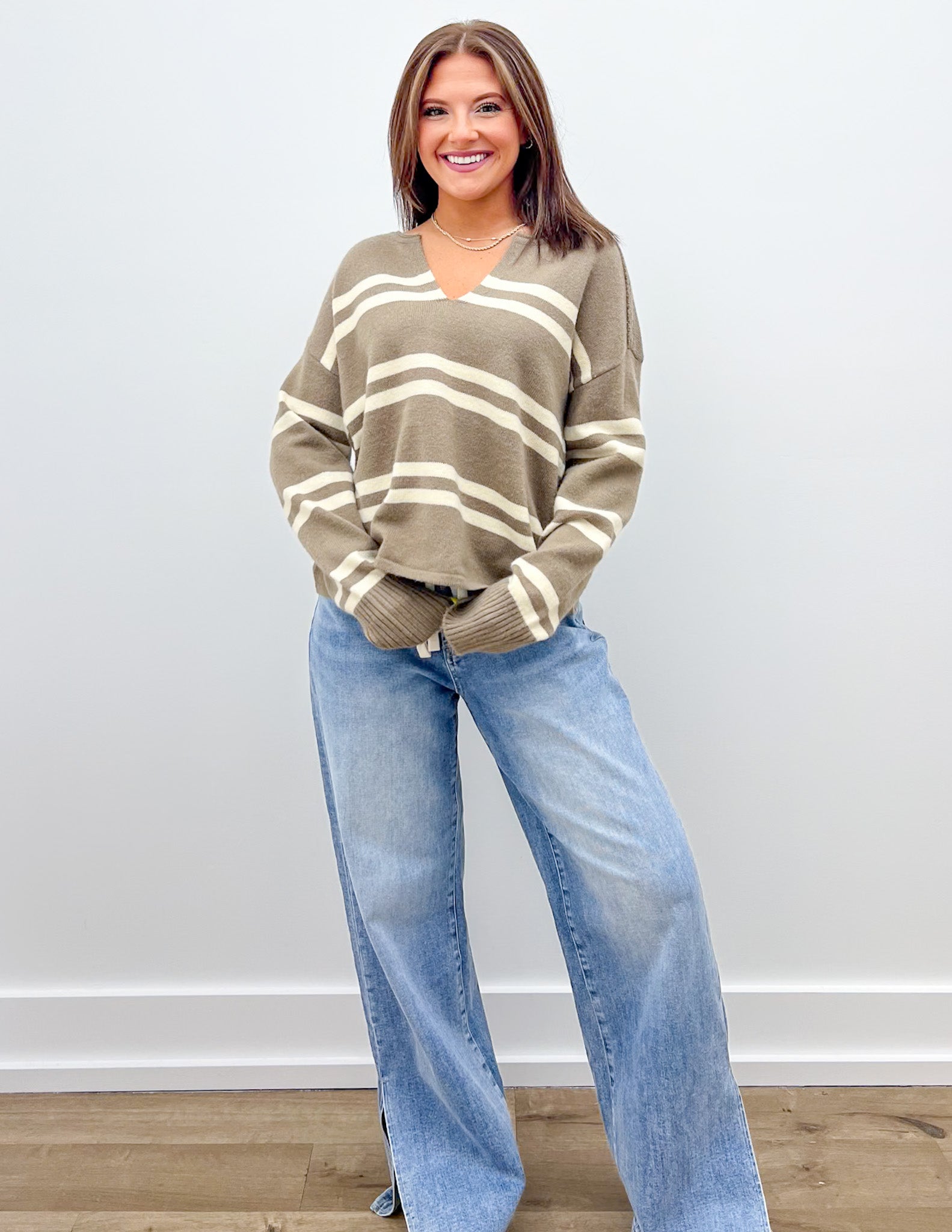 NOTCH NECK STRIPED SWEATER 43% ACRYLIC 29% NYLON 28% POLYESTER