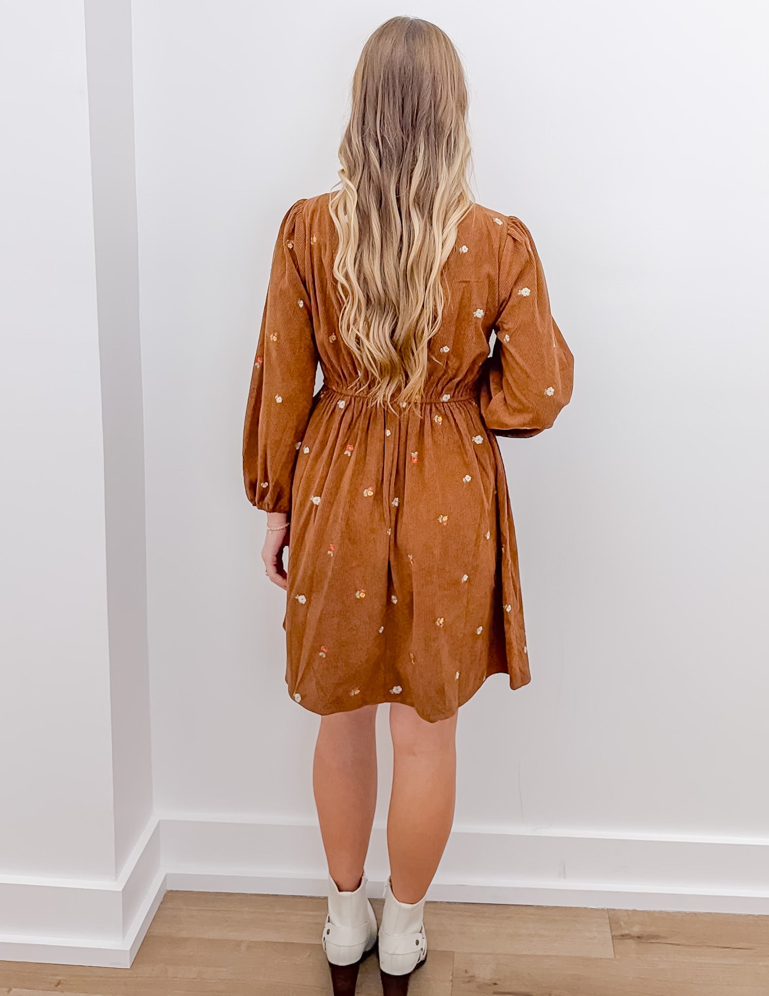 FLORAL EMBROIDERED CORDUROY V NECK MINI DRESS -100% POLYESTER