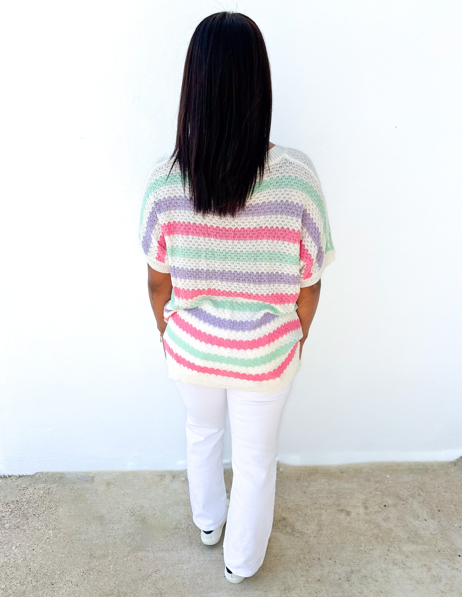 LOW GAUGE MULTI COLORS STRIPE V-NECK SHORT SLEEVE KNIT TOP