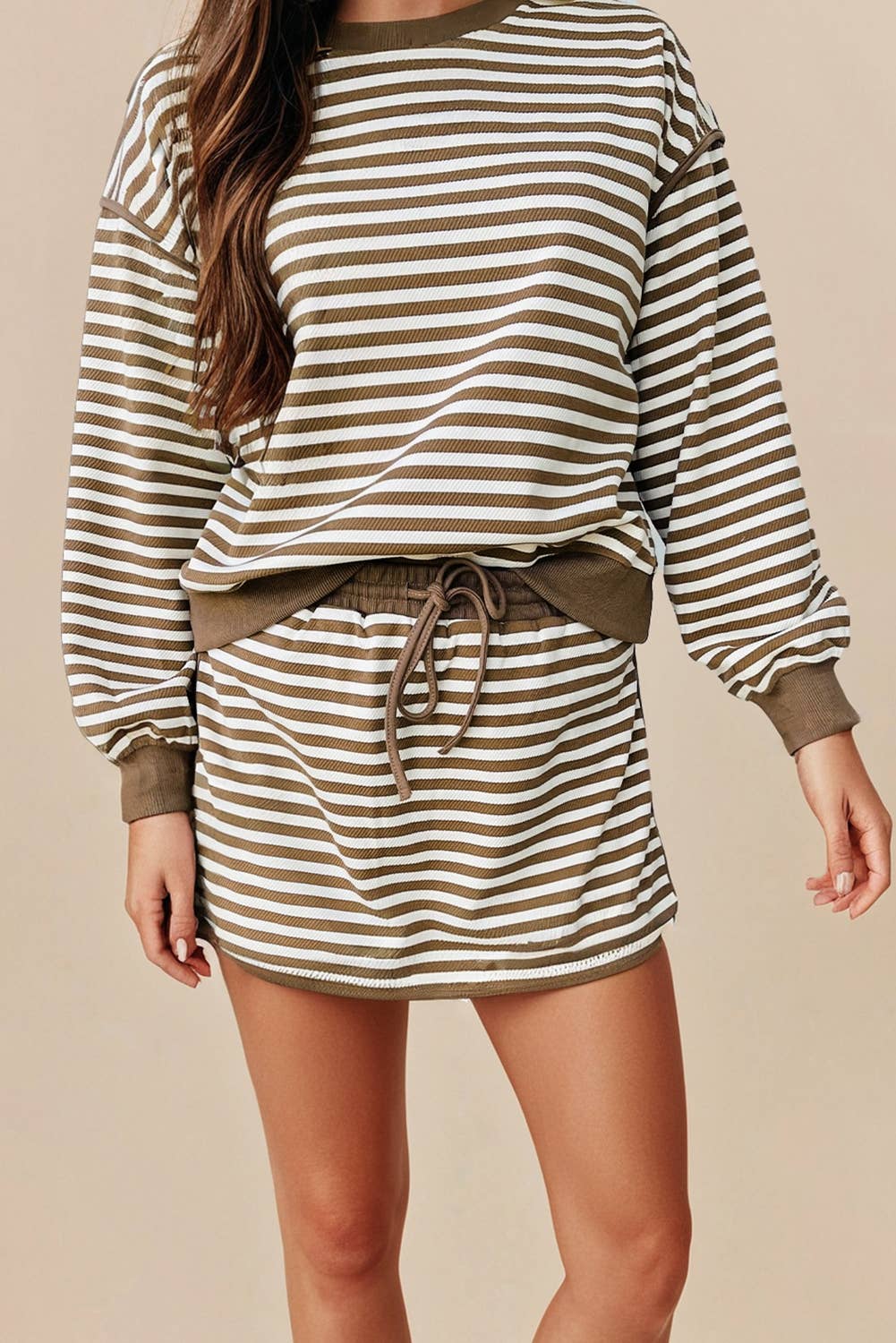 Missy Stripe Textured Pullover Top/Skirt Set in Brown