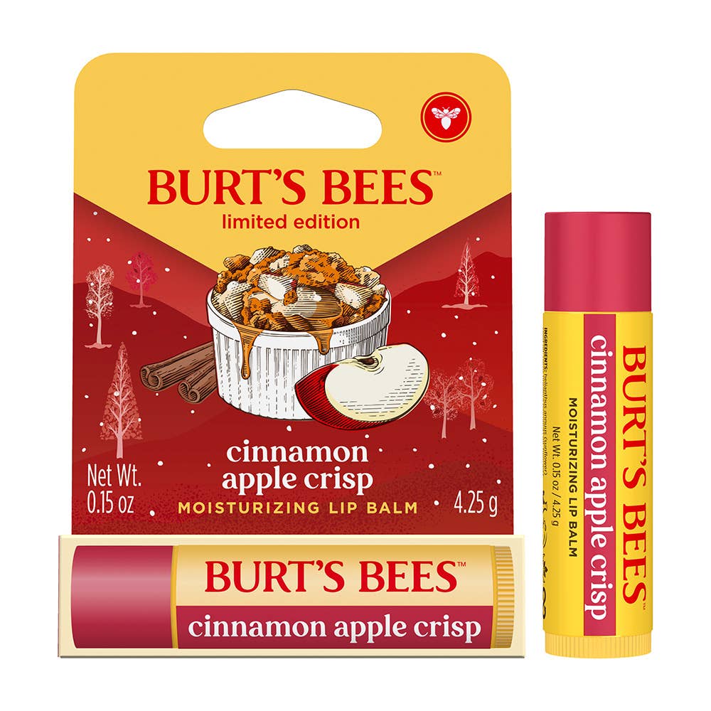Enjoy the comforting flavors of warm baked apples and cinnamon as Burt’s Bees Cinnamon Apple Crisp Moisturizing Lip Balm conditions and hydrates dry lips. This limited edition lip balm is tint free and glides on smoothly with responsibly sourced beeswax to moisturize lips and keep them hydrated for up to 24 hours.