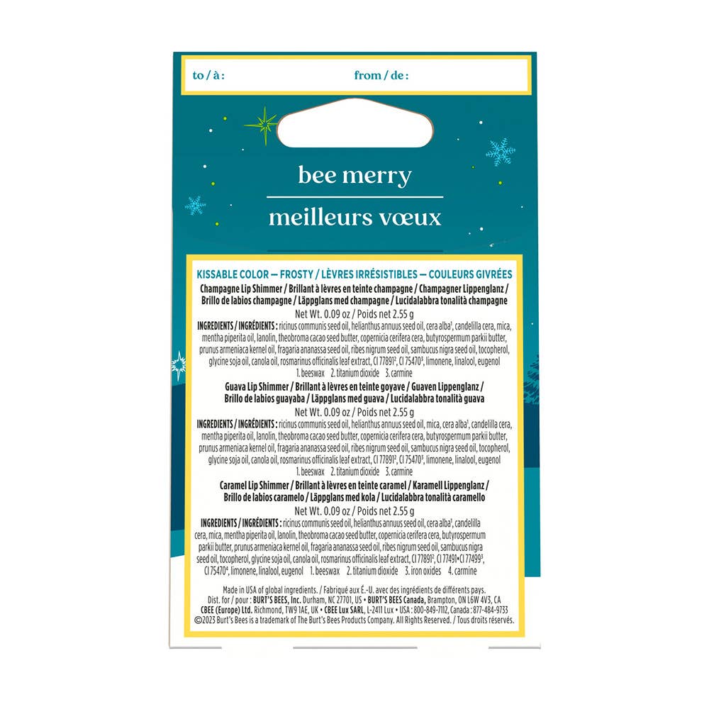 Give your loved ones the gift of soft, bright and shimmery lips with this Burt's Bees Kissable Color Lip Shimmer Gift Set. Made with shea butter and antioxidant-rich fruit oils, Burt's Bees Lip Shimmer offers a smooch of luminescent color, high-impact moisture and an invigorating peppermint flavor. The gift set includes three stunning cool shades—champagne, guava and caramel—perfect for layering over your favorite lipstick or for applying on nude lips for a shimmering hint of color. One 3-pack of Burt's Bees Kissable Color Frosty Collection Lip Shimmer Gift Set in festive packaging that's ready to gift for winter holidays. Enriched with sunflower oil, vitamin E and responsibly sourced beeswax, this lip shimmer moisturizes and softens lips.