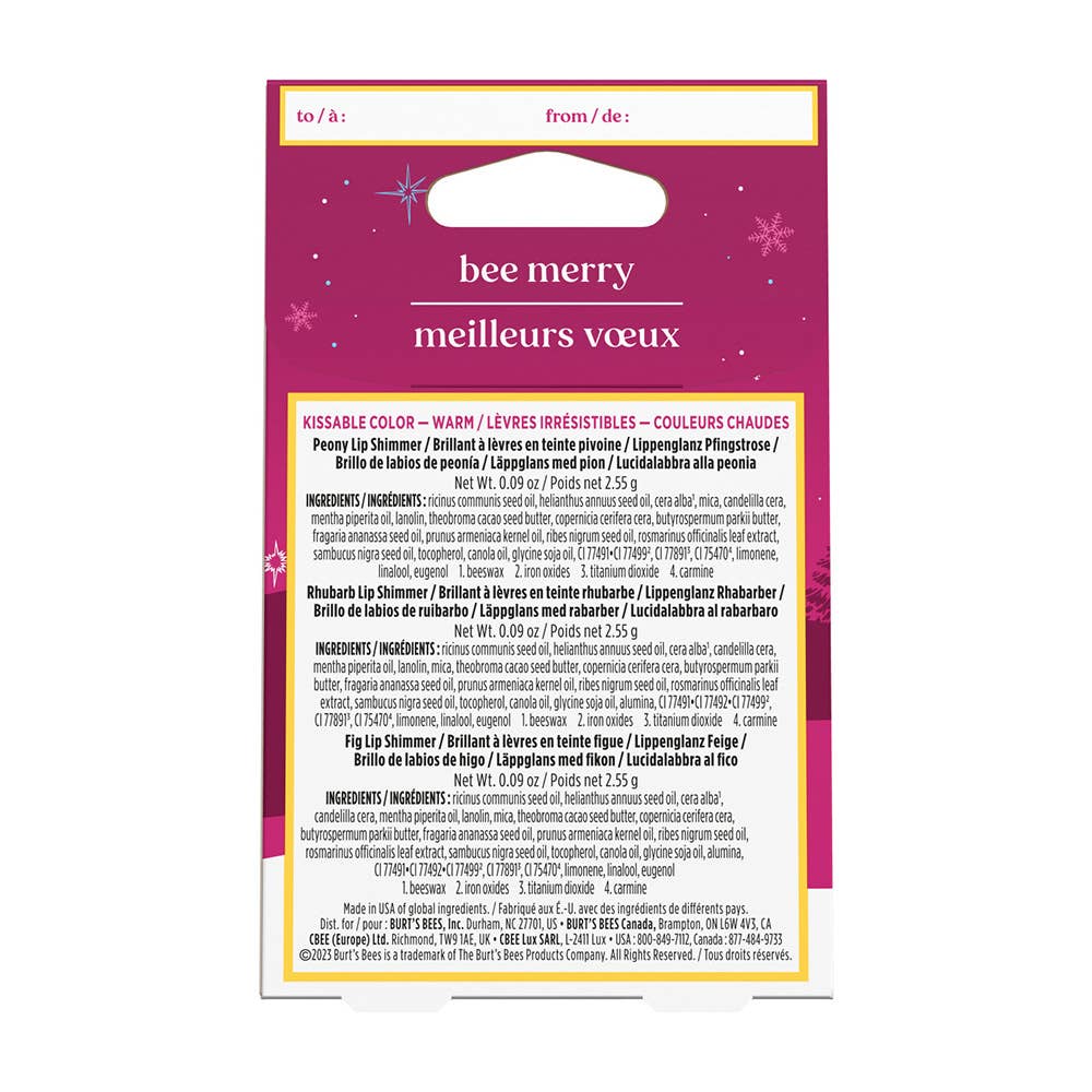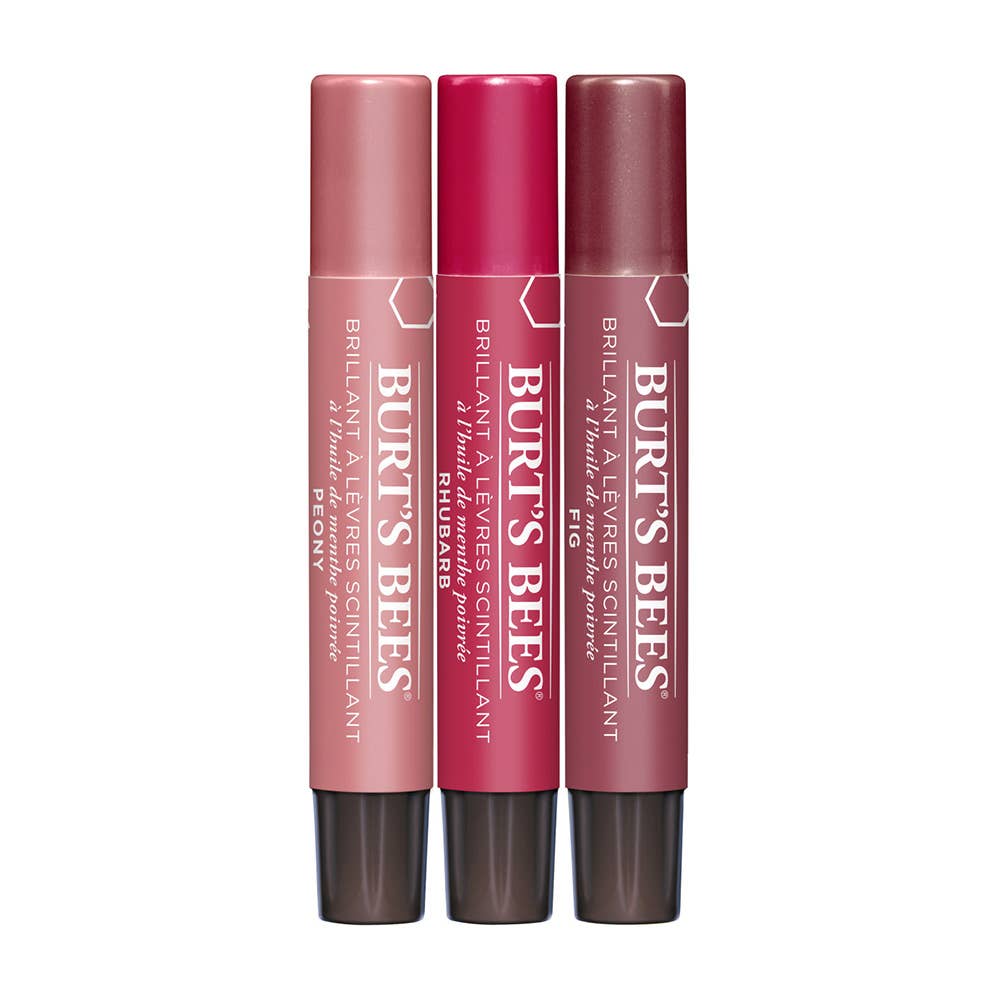 Give your loved ones the gift of soft, bright and shimmery lips with this Burt's Bees Kissable Color Lip Shimmer Gift Set. Made with shea butter and antioxidant-rich fruit oils, Burt's Bees Lip Shimmer offers a smooch of luminescent color, high-impact moisture and an invigorating peppermint flavor. The gift set includes three stunning cool shades—champagne, guava and caramel—perfect for layering over your favorite lipstick or for applying on nude lips for a shimmering hint of color.