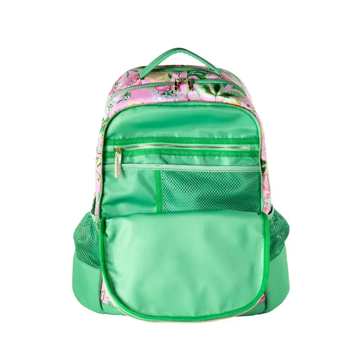 Keep your essentials organized and on-trend with our backpack. Featuring multiple interior and exterior pockets this backpack is splashed with a bright Lilly print that's accentuated by an adjustable strap and a top handle. A gold Lilly logo plaque adds a final bit of shine to this everyday must-have