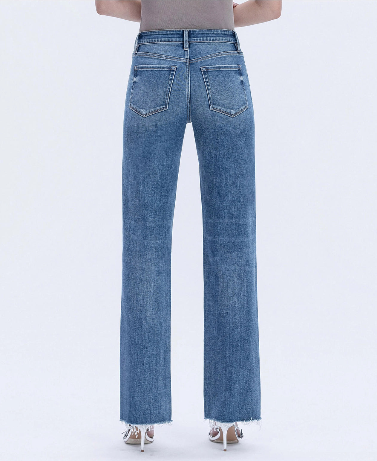 PRODUCT DETAILS:High rise frayed hem slim wide jeans Comfort stretch denim, high rise waist, distressed detail, frayed hem, full length, slim wide jeans ADULT FEMALE