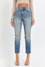 - High-Rise Mom Jean - Knee Distressing - Tinted Denim - 5 Pockets - Import - Inseam: 28" Rise: 11 1/2" - Model is 5'9 wearing size 3