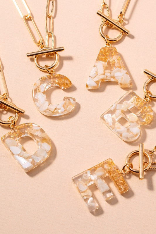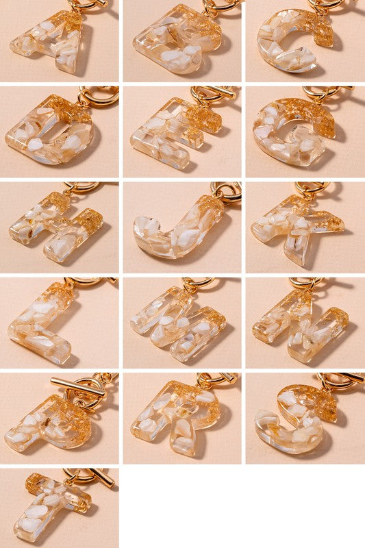 initial letter chain bracelets with toggle closure. Has A,B,C,D,E,G,H,J,K,L,M,N,P,R,S,T