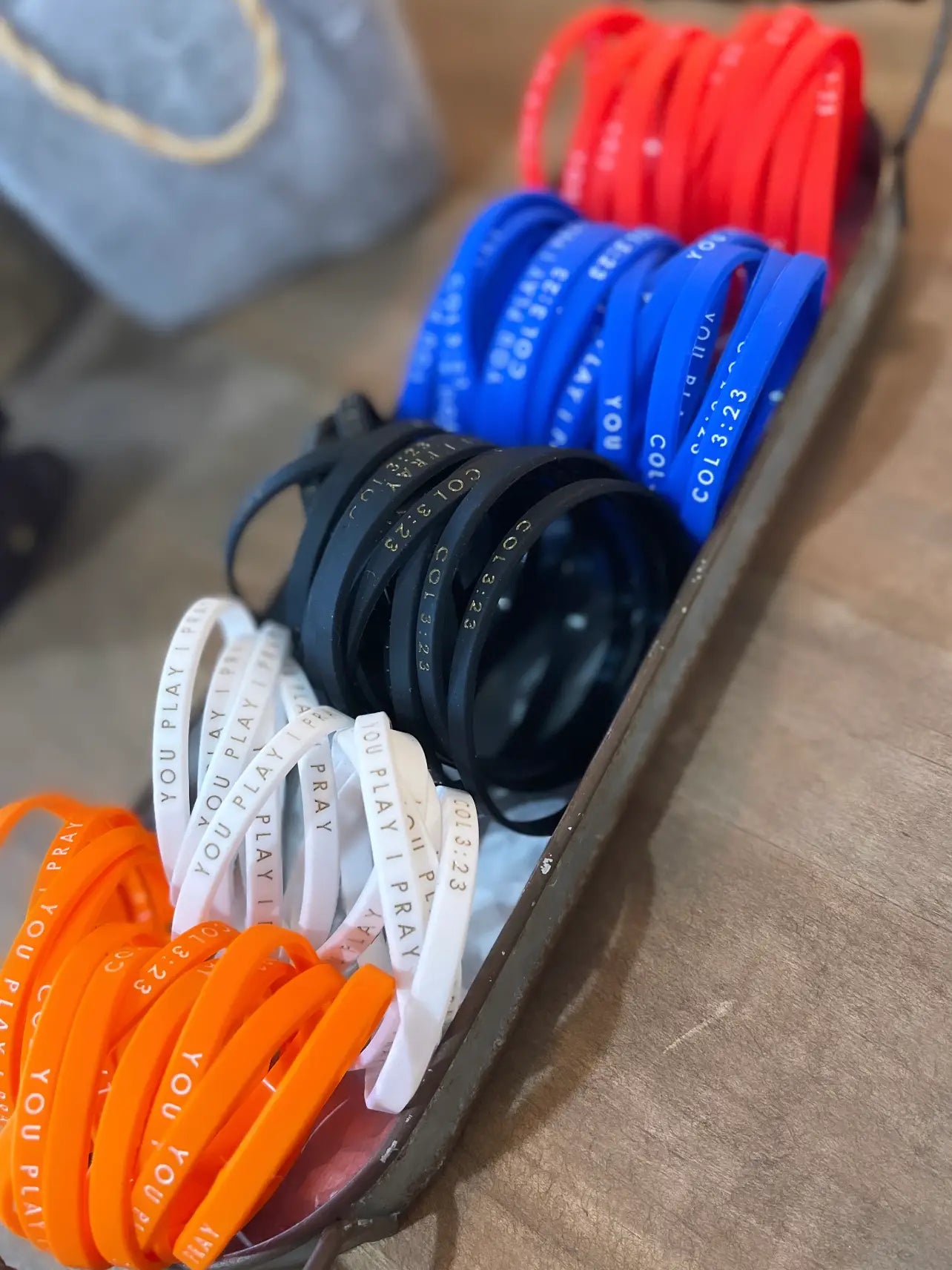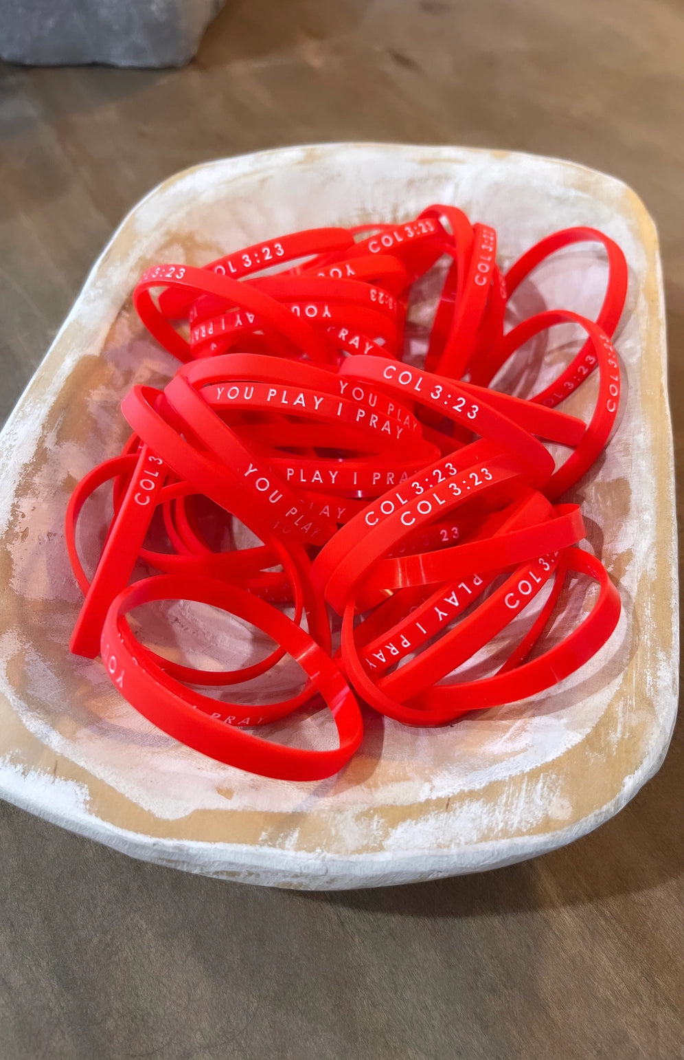Team color silicone bracelets with You Play I Pray and Col. 3:23. Wear your color and start a conversation .