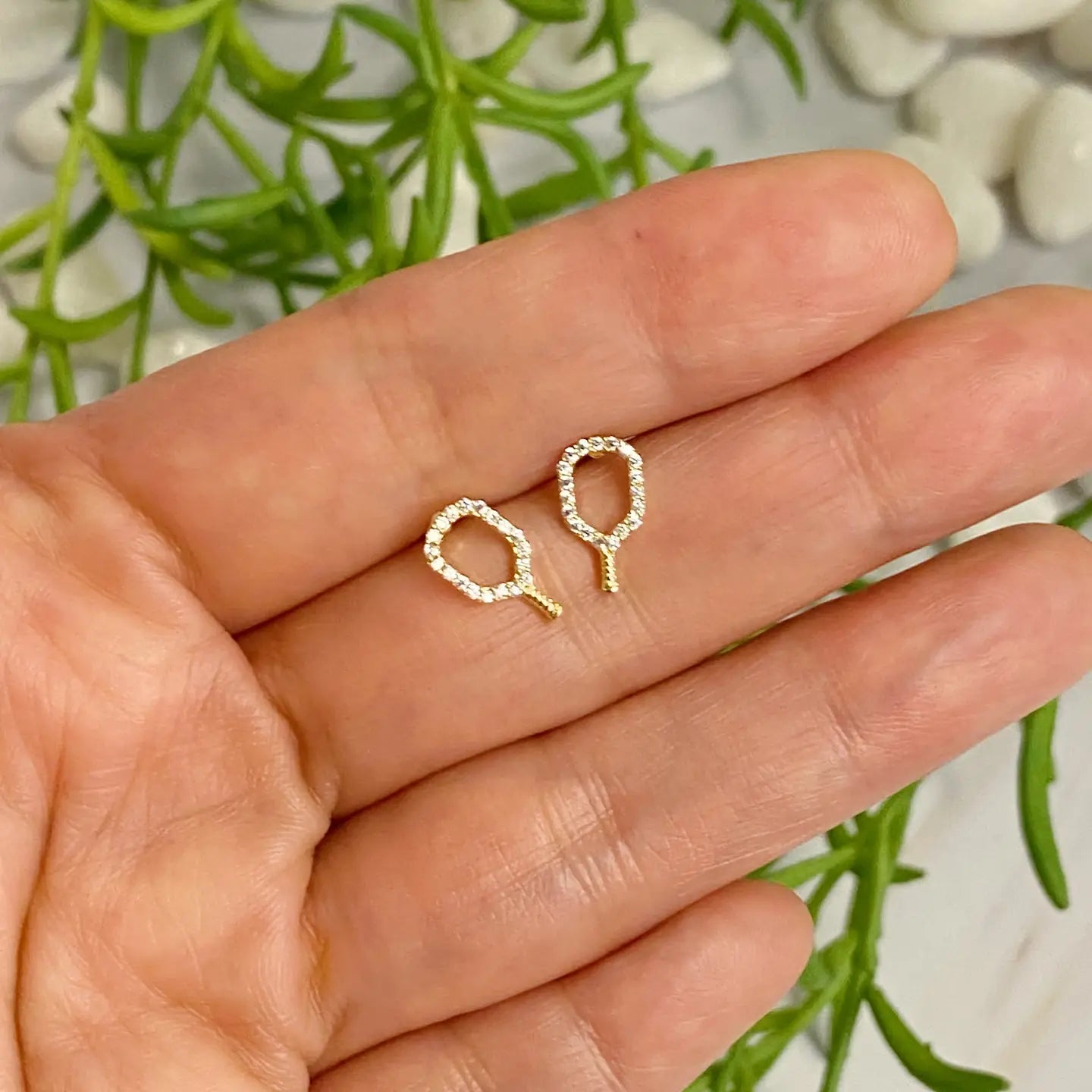 These Club Pickleball Dainty Earrings are perfect for any pickleball fan. Expertly crafted with a pickleball racket outline, these light and elegant earrings make a subtle statement. With its small and simple details, this earring will add a stylish touch to any outfit. Matching necklace is available to purchase separately 16 inch long chain with a 2 inch extender Gold plated brass Lead and Nickel compliant