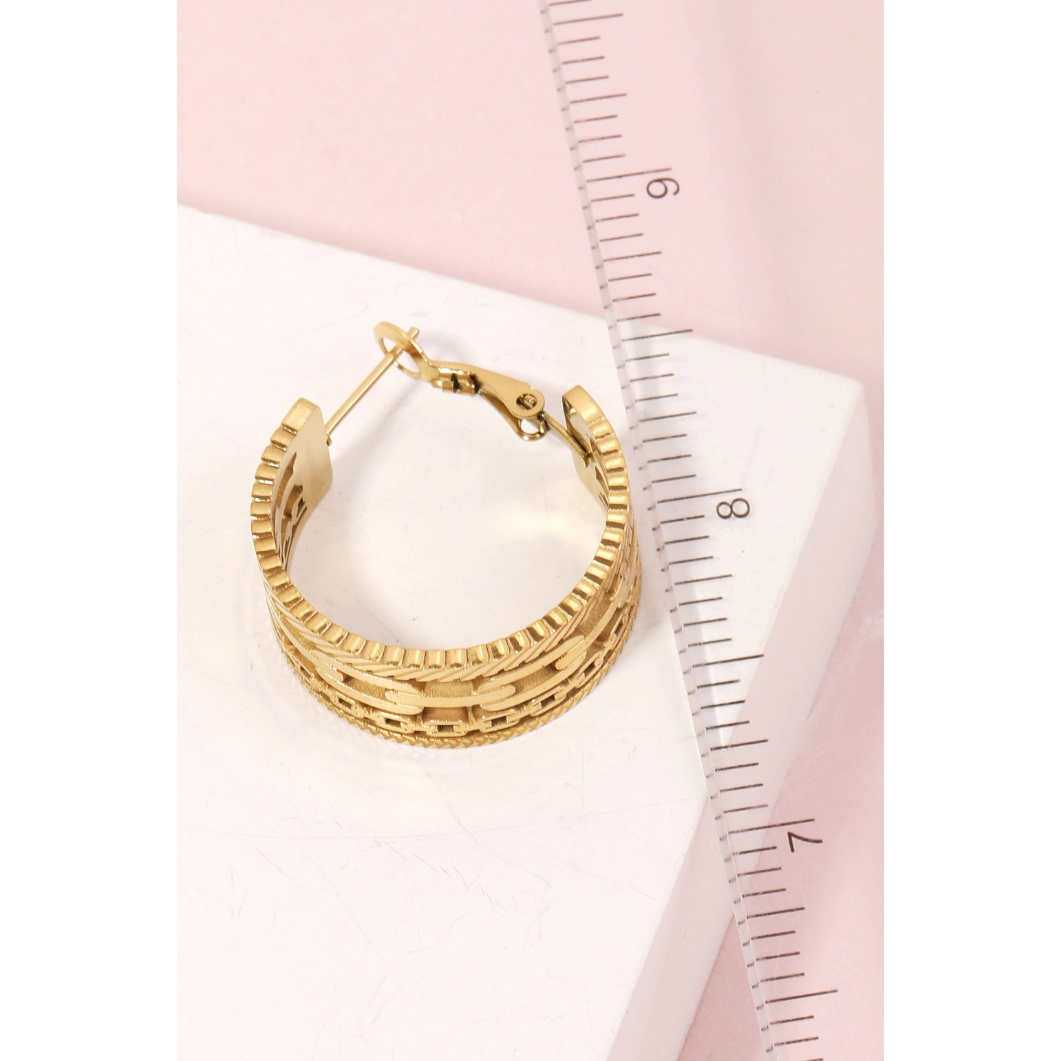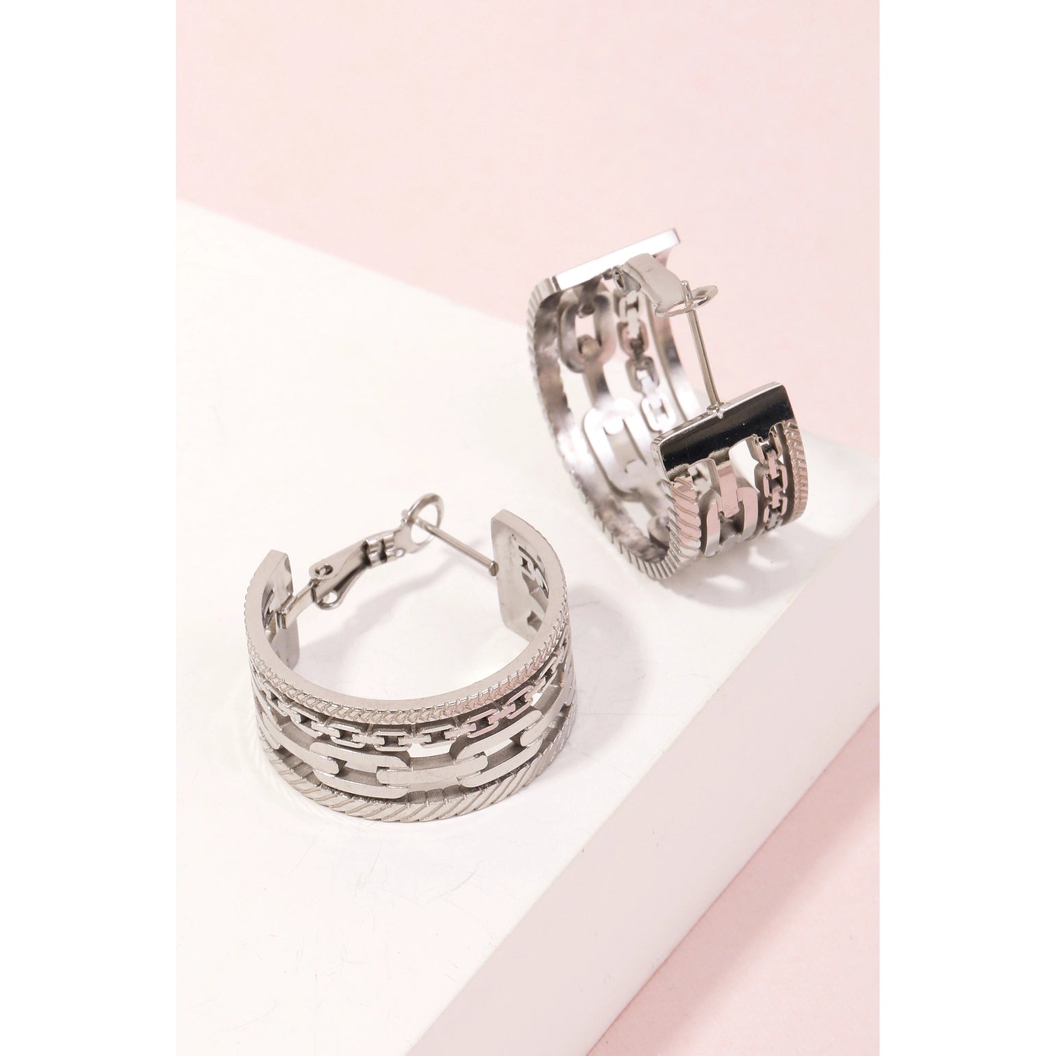 A unique and stylish piece that sets you apart, this pair of hoop earrings emanates an elegant matte chain texture hoop earrings design. A versatile accessory that's perfect for any occasion, adding a touch of elegance and style to any outfit. This pair of hoop earrings is made with 100% Stainless Steel.