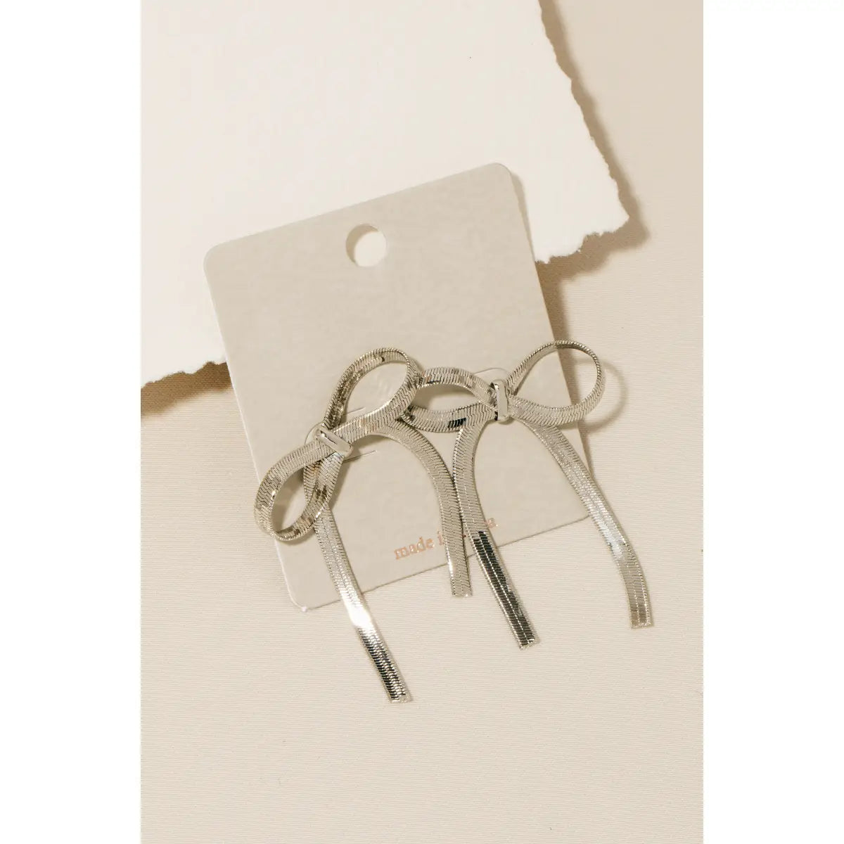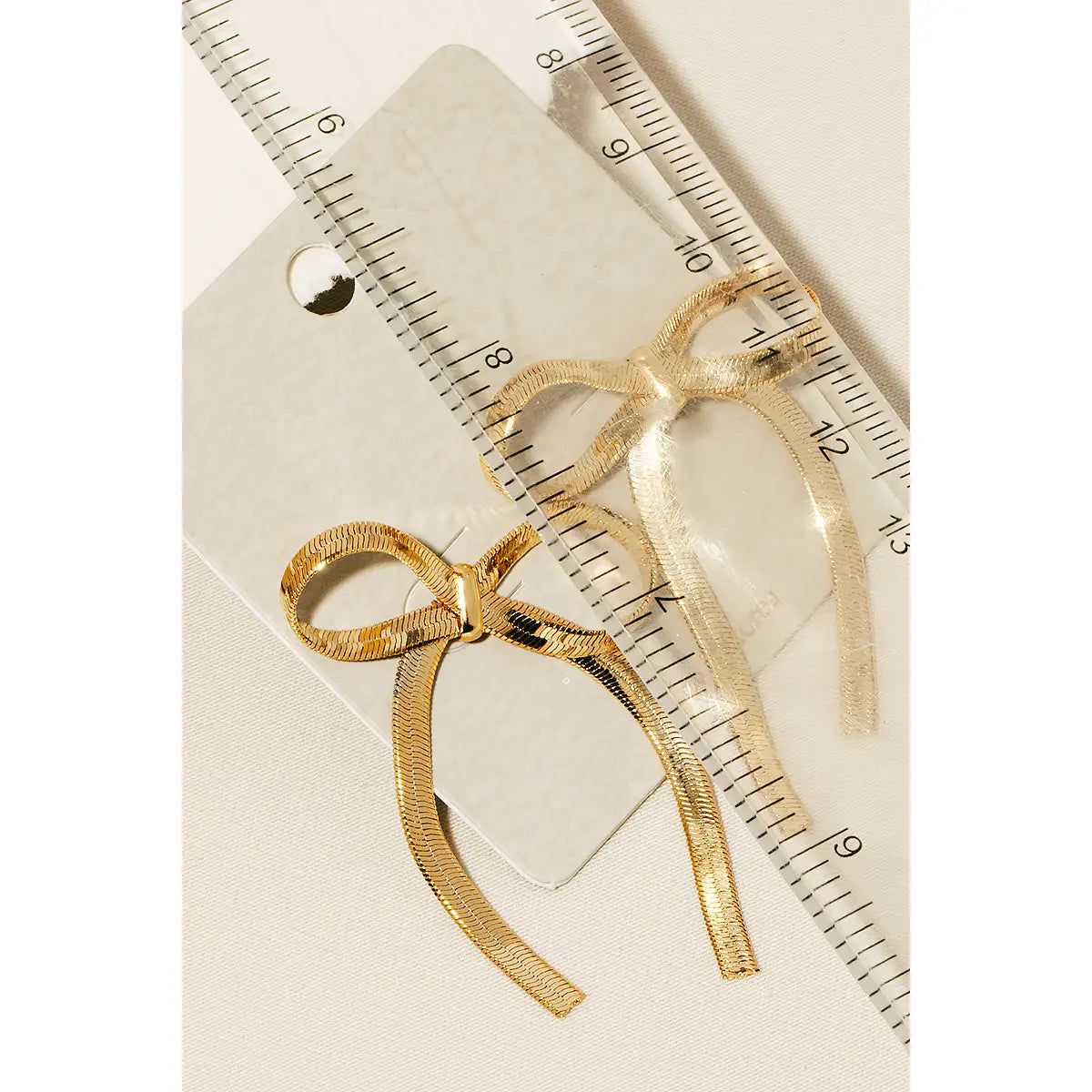This piece is both elegant and versatile, this pair of earrings includes a stunning herringbone chain ribbon bow design. This item is a great way to add some texture and dimension to any outfit. This pair of earrings is made with 100% Brass. Made in Korea.