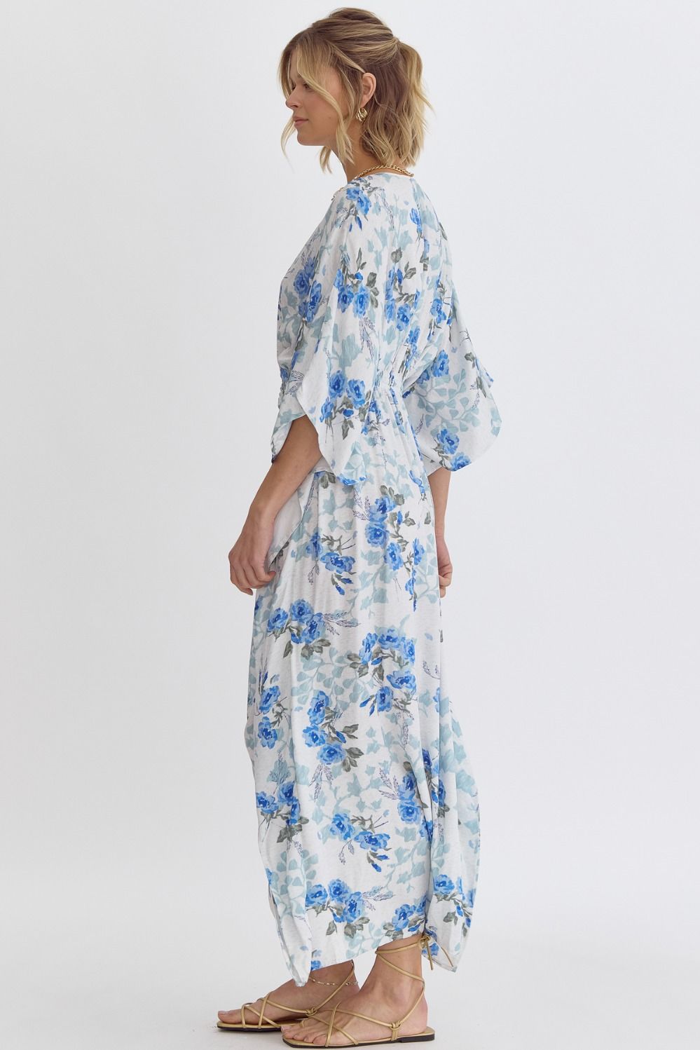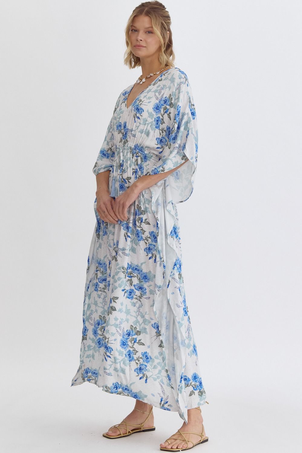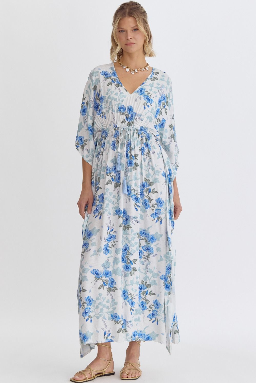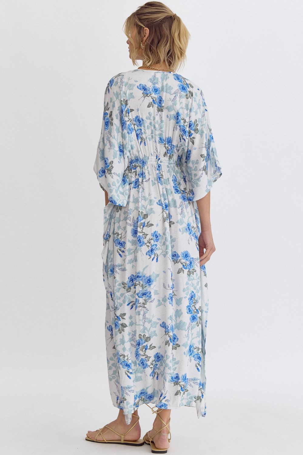Floral print v-neck half sleeve maxi dress featuring self-tie detail at cinched waist. Split at hem. Unlined. Knit. Non-sheer. Lightweight.