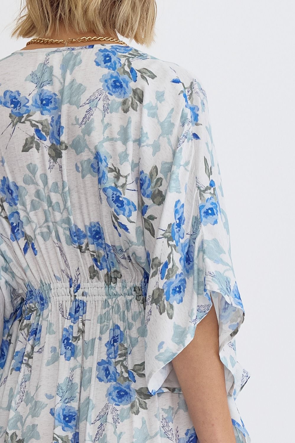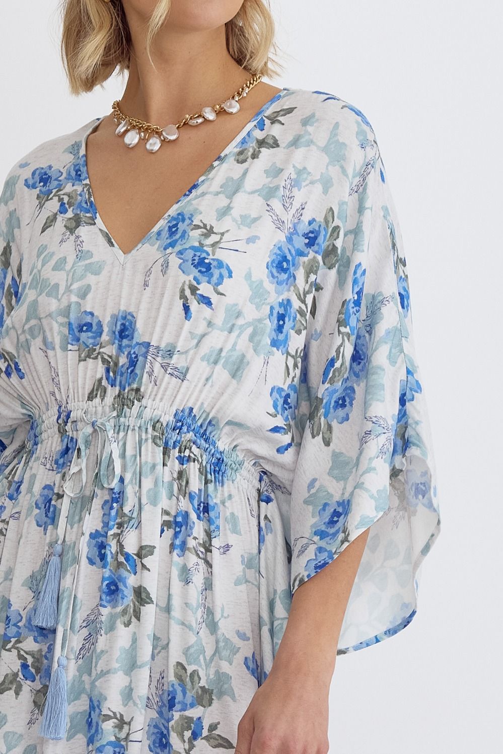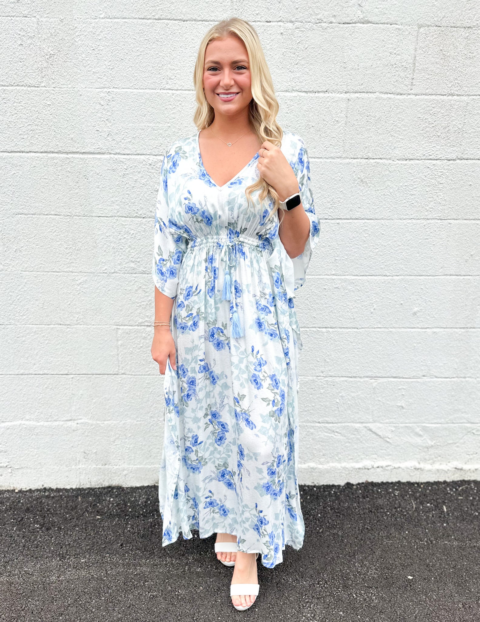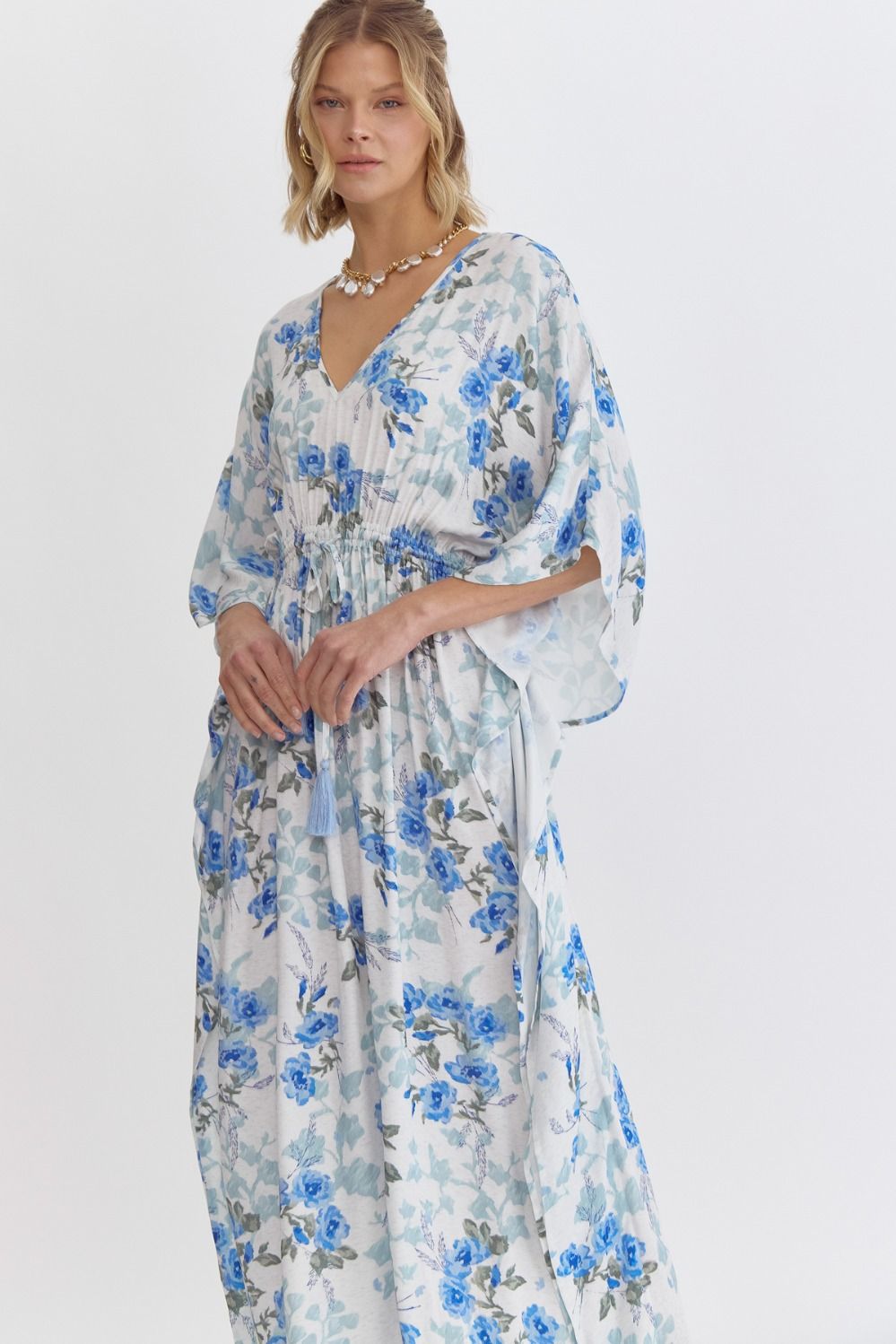 Floral print v-neck half sleeve maxi dress featuring self-tie detail at cinched waist. Split at hem. Unlined. Knit. Non-sheer. Lightweight.