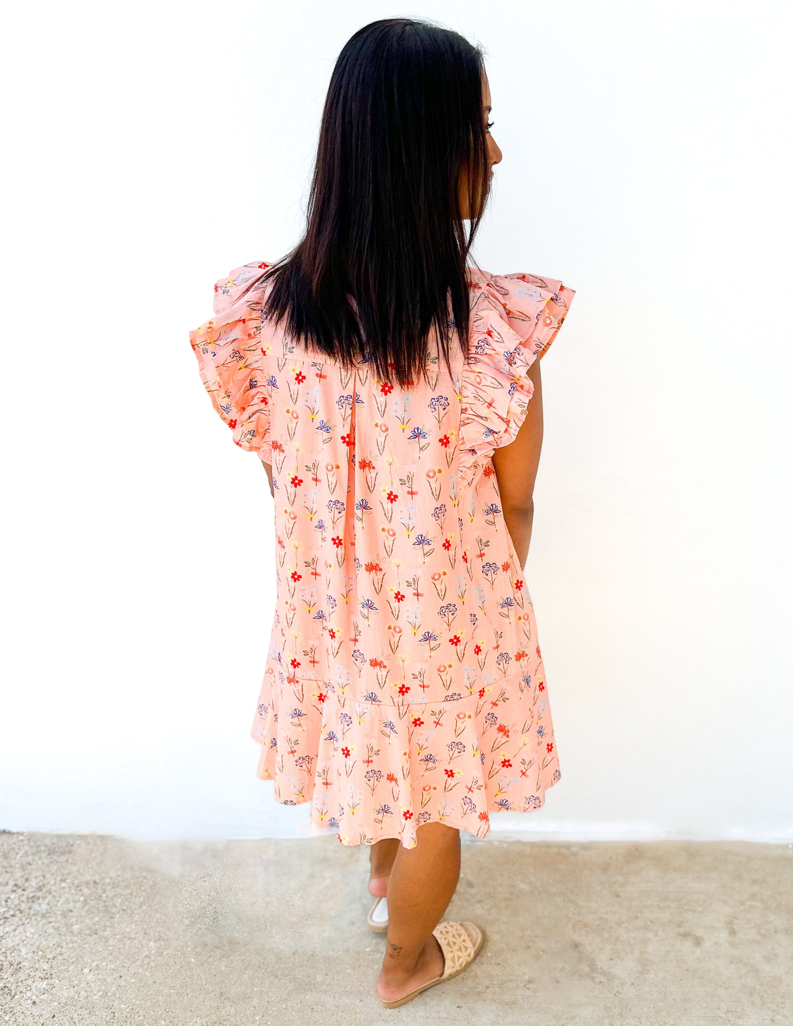 Floral print spread collar half button closure ruffle hem pullover mini dress. Ruffle over shoulder sleeves. Lined. Woven. Non-sheer. Lightweight.