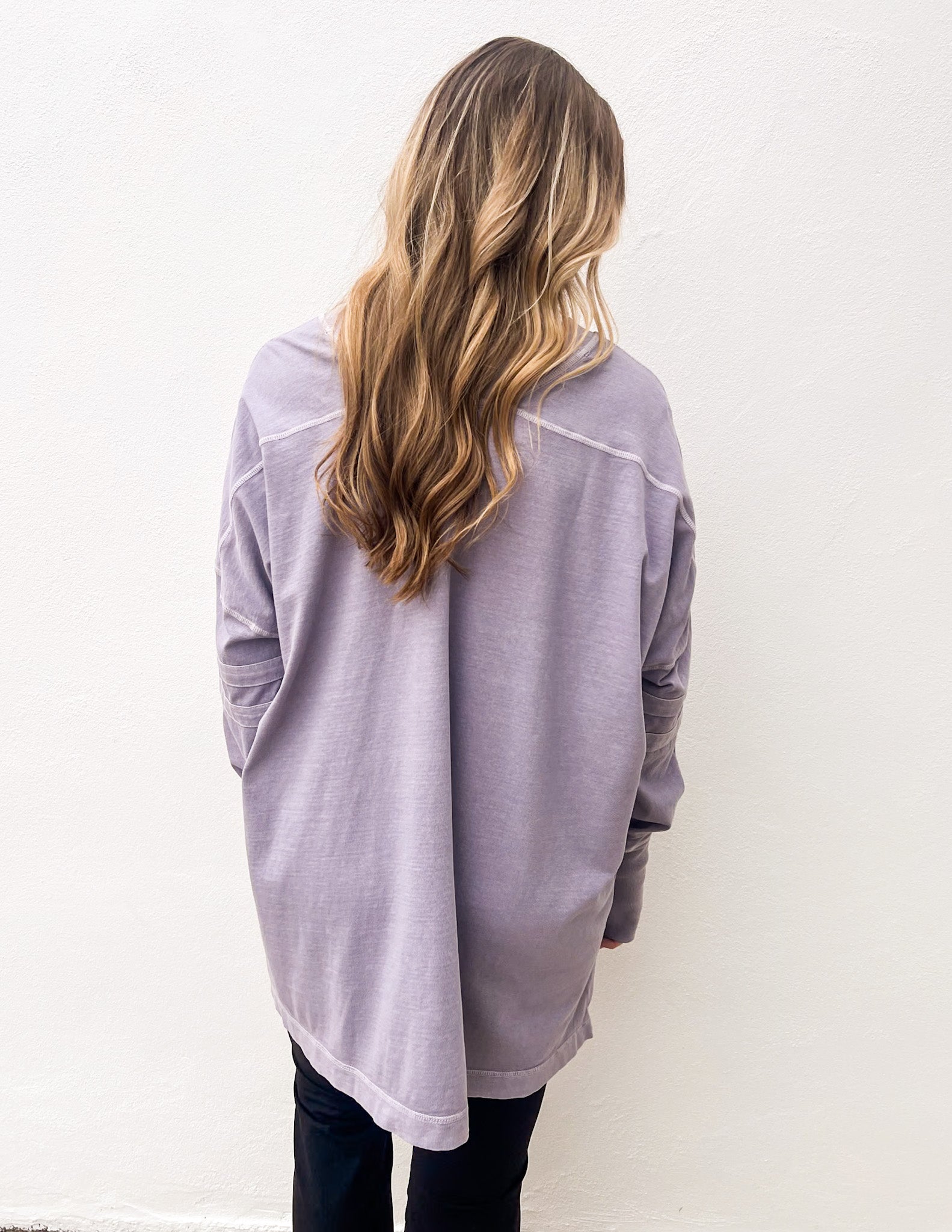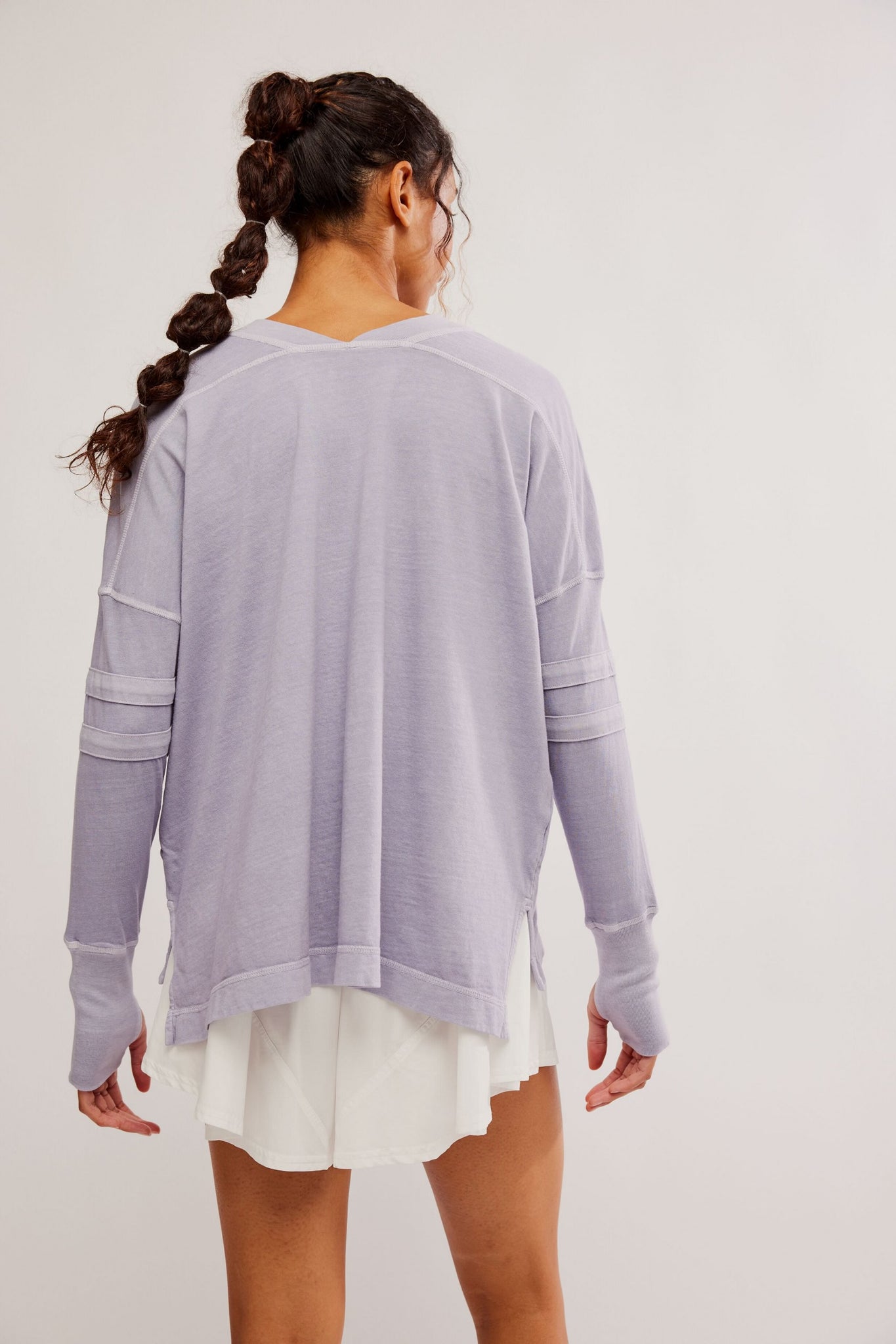 So classic long-sleeve tee featured in a soft cotton fabrication and oversized fit with a V-neckline and thumbholes at both wrists.