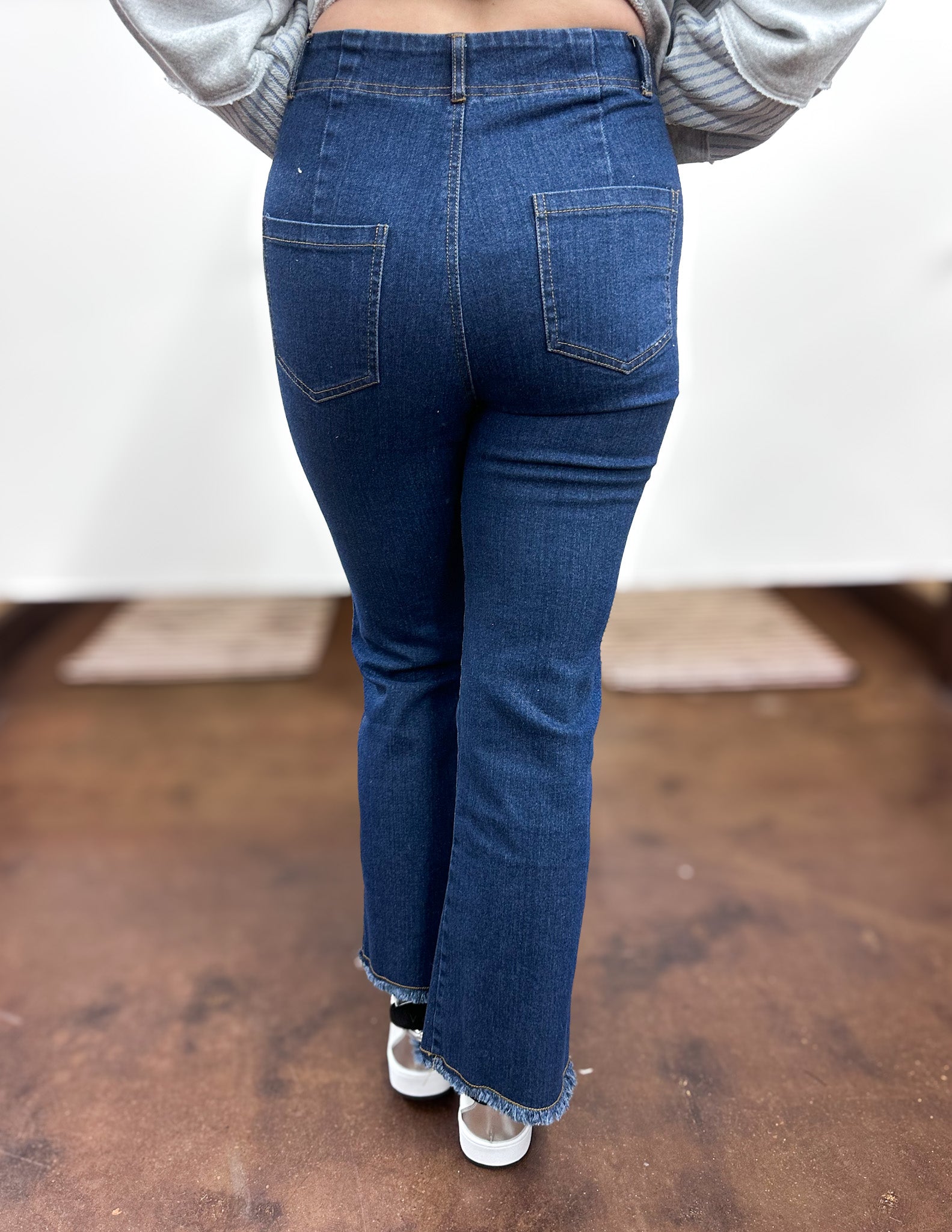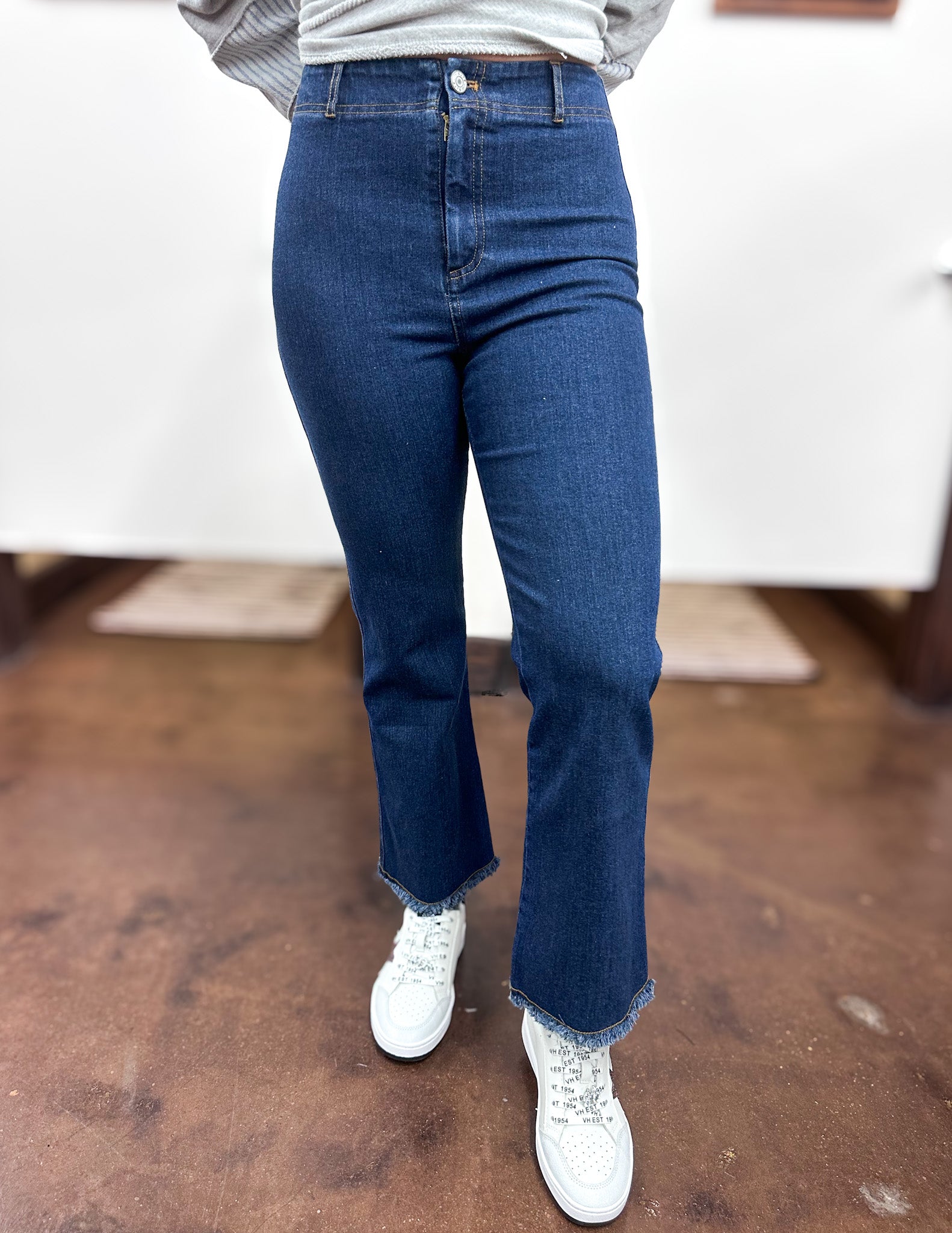 featuring high-rise, button closure at front, wide leg that hits above the ankle. Cut