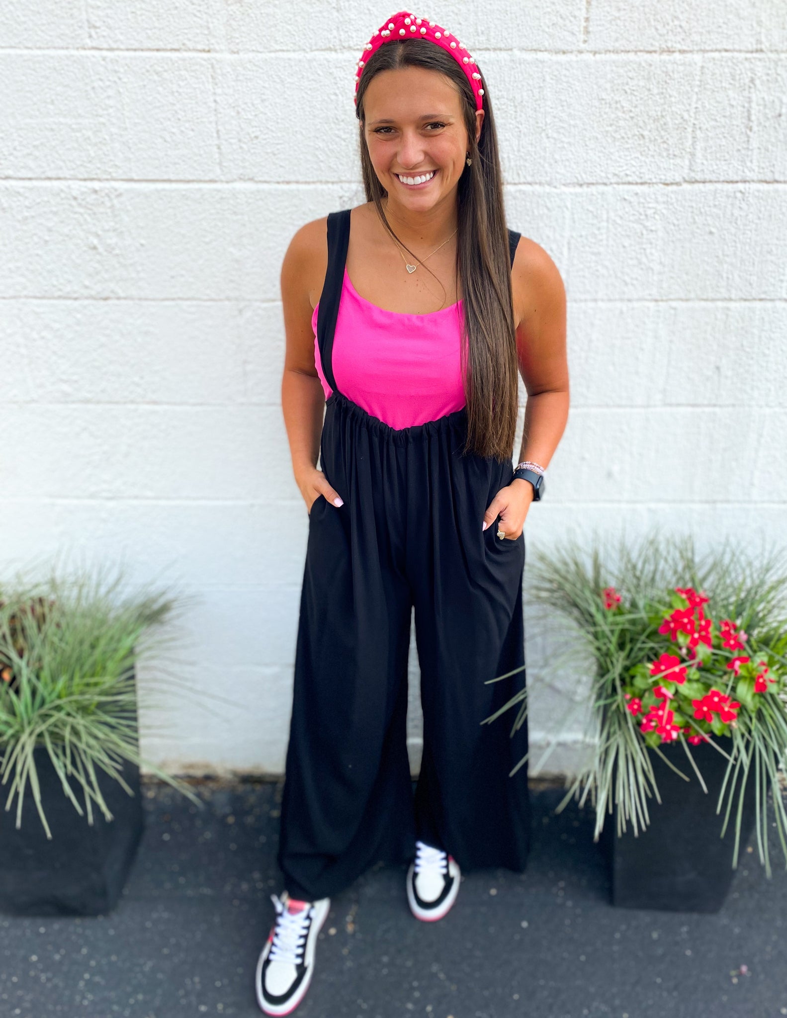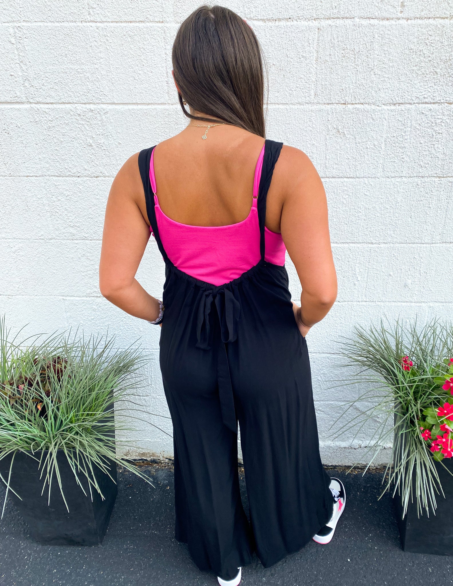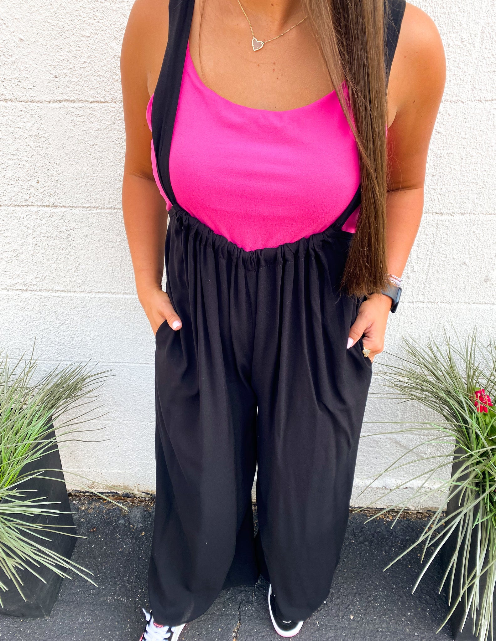 WASHED WOVEN SOLID SUSPENDER STYLE JUMPSUIT.