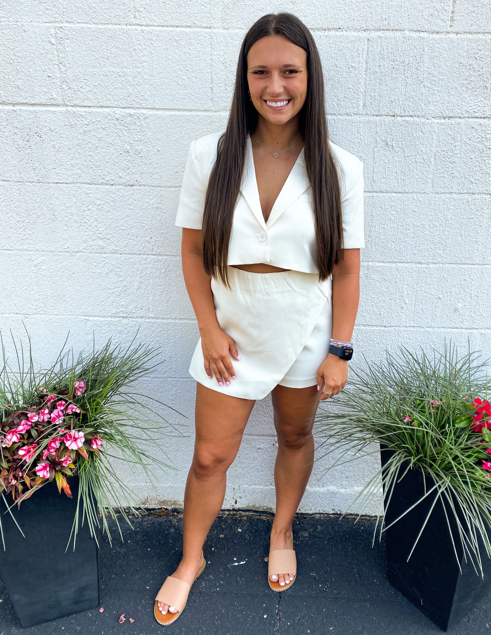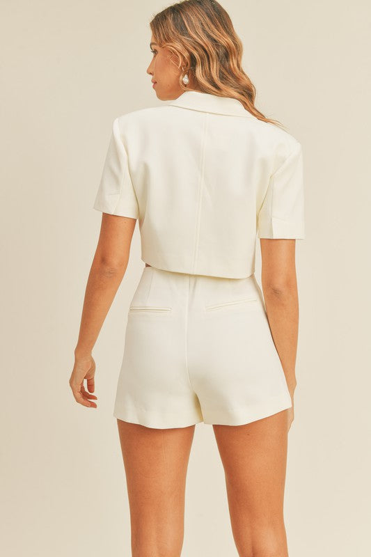 Short sleeve crop jacket and matching skort with overlay detail set. Lining.