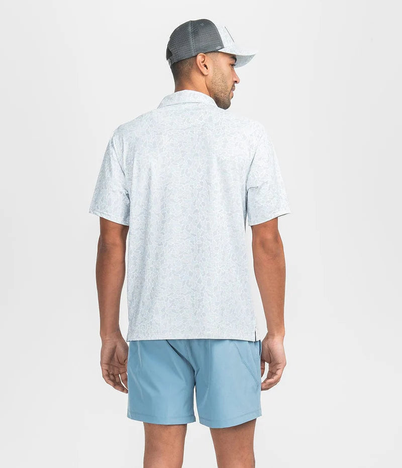 Shayne is 6'3" and wearing a medium in Hunters Hideaway Printed Polo in River Rock.
