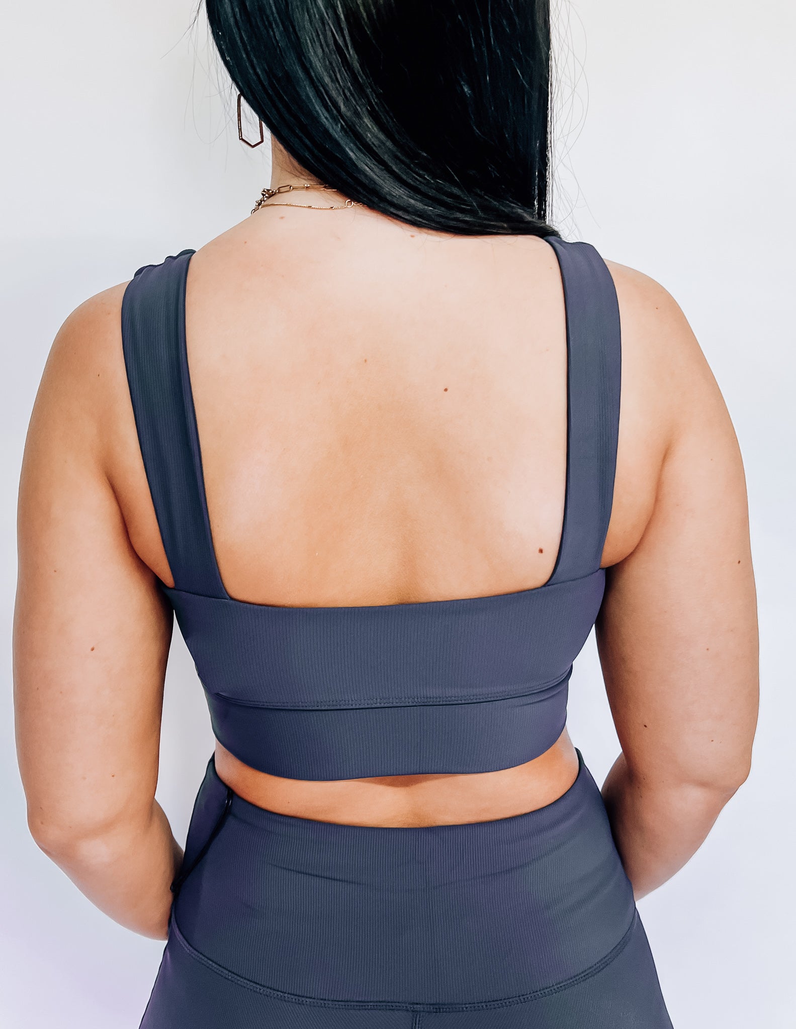 We updated the classic sports bra by constructing it with a solid, performance-level fabric with a micro-ribbed texture. The wide hemline that curves in the center front creates a flattering silhouette. 79% nylon, 21% Lycra®. Tummy-control.