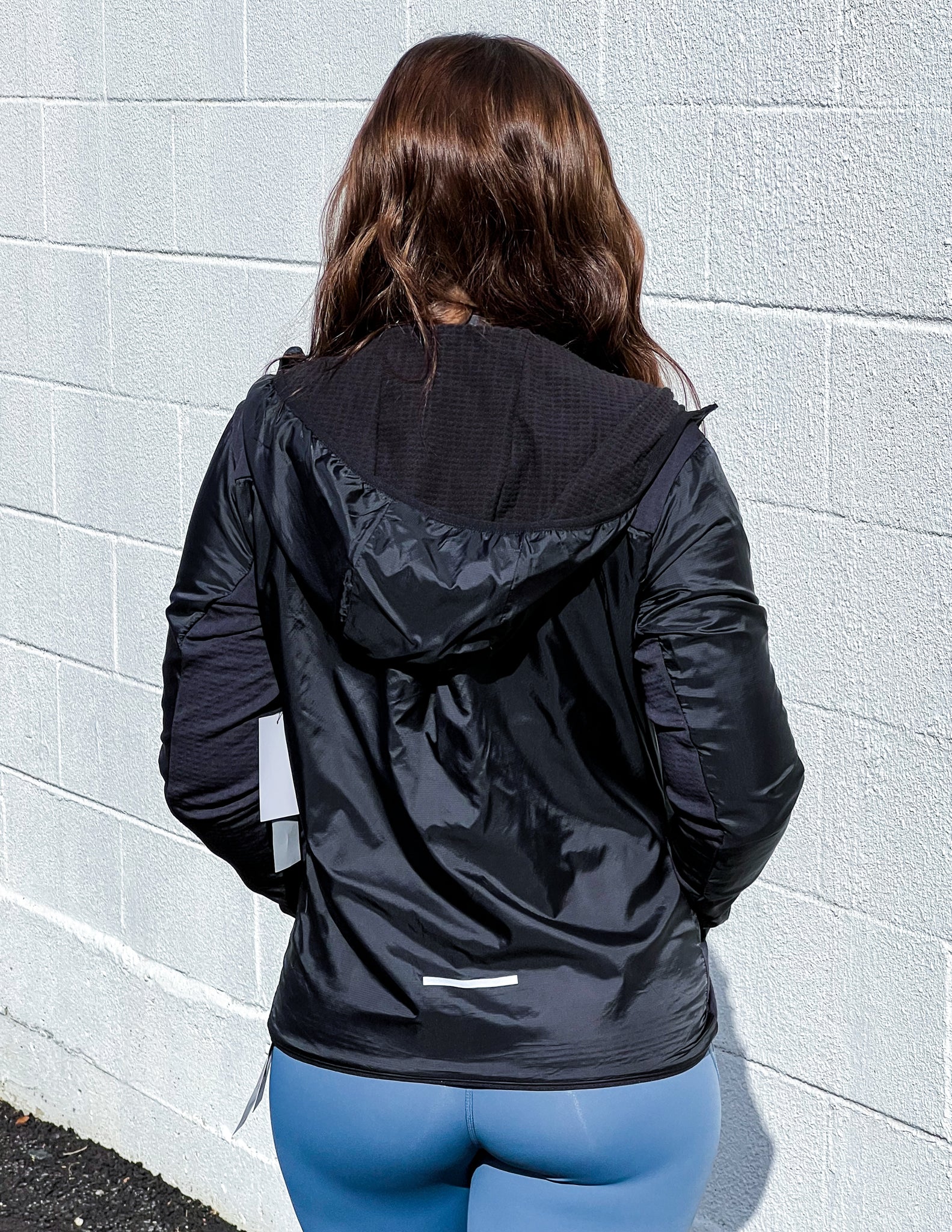front zip, hand pockets, and a reflective strip at the center back for visibility.