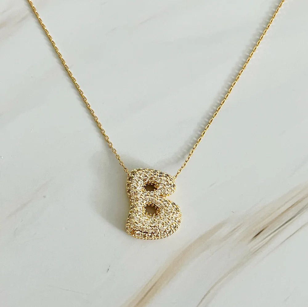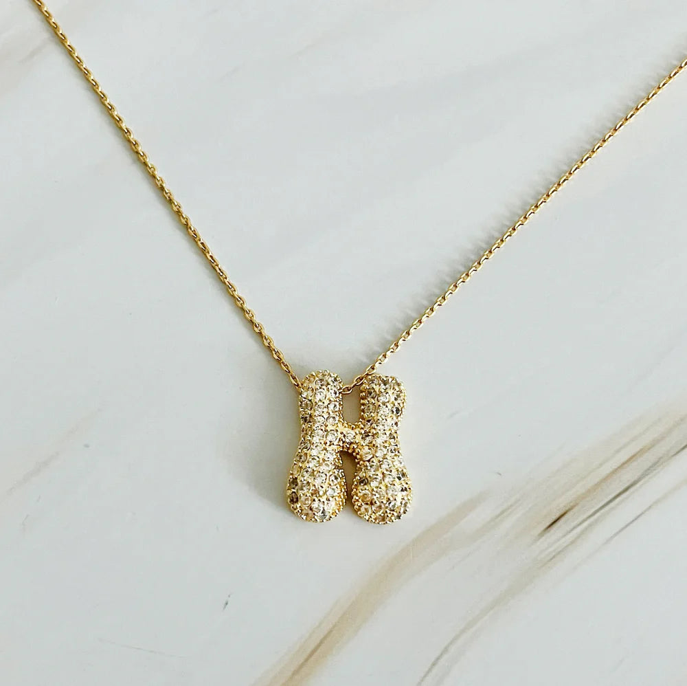 Introducing our Crystal Bubble Initial Necklace, featuring adorable puffy shaped initials adorned with sparkling crystals. Stand out and make a statement with this versatile piece, whether you wear it alone or layer it with other accessories. Perfect for adding a touch of sparkle and personalization to any outfit.