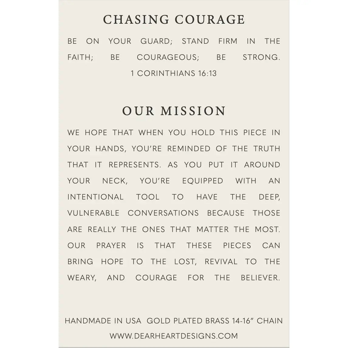 She decided that being scared was okay And that fear would not stop her. I think that’s what they call courage. Courage isn’t to never be afraid, it is simply not allowing the fear you face to stop you. Decide that it’s okay to be afraid, but don’t allow fear to steal the good things He has in store for you. Move forward in confident trust when you find yourself worried. The plans He has for His people are good and He remains with them every step of the way. You are courageous and strong in Him! I chose a chain with repeating crystal beads, representing us continually chasing courage in our lives.