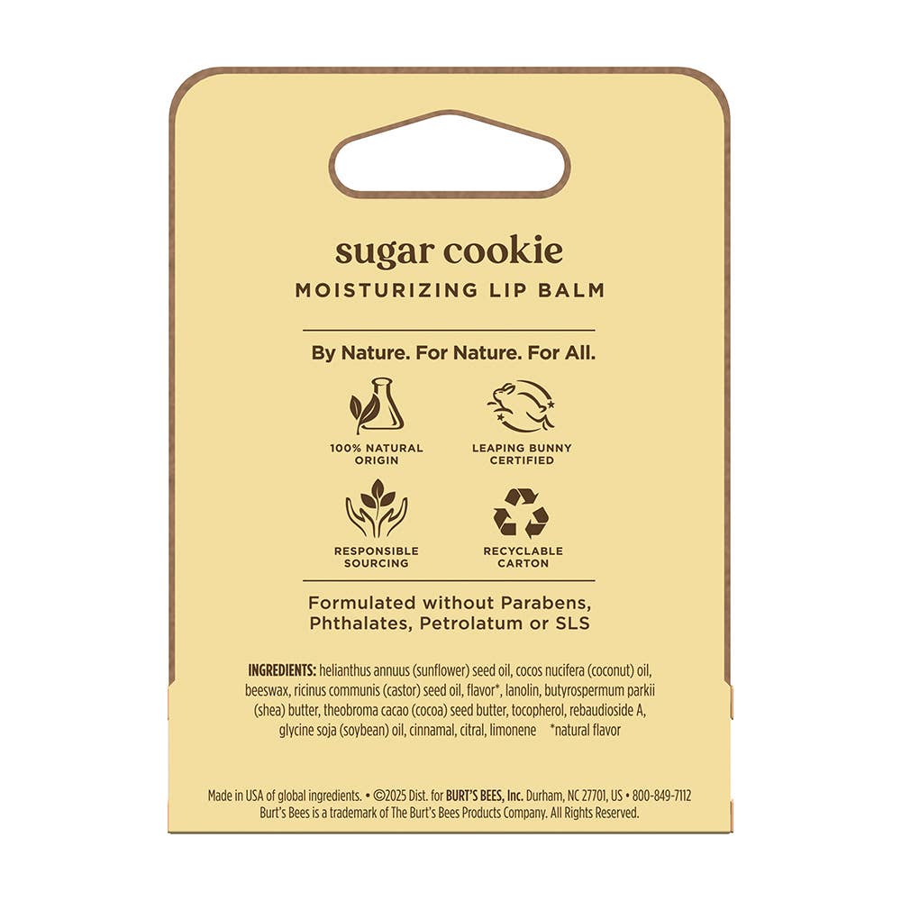Enjoy the sweet, buttery flavor of Burt’s Bees Sugar Cookie Moisturizing Lip Balm as it conditions and hydrates lips. This limited edition, tint free lip balm glides on smoothly with responsibly sourced beeswax to moisturize dry lips and keep them hydrated for up to 24 hours.