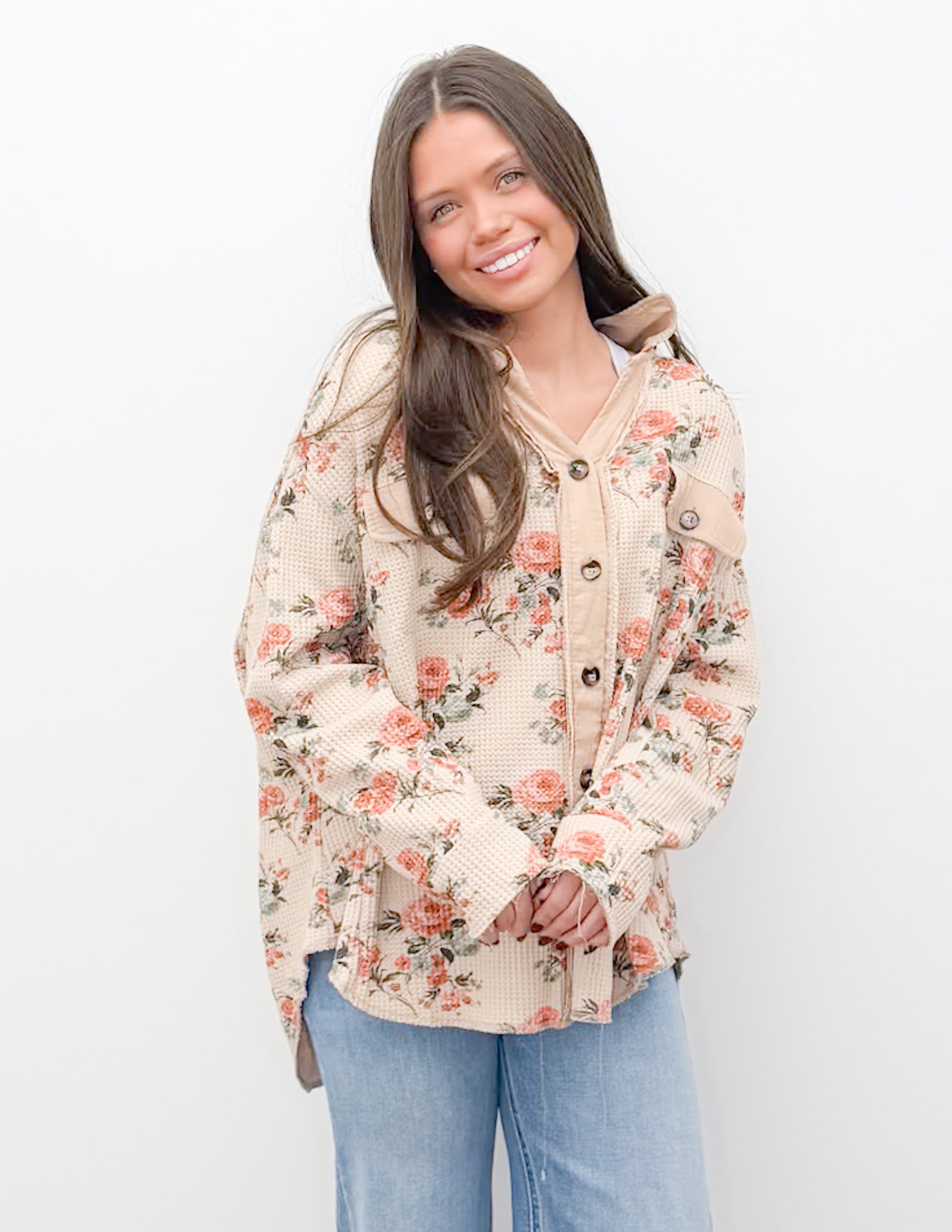 FLORAL PRINT WASHED WAFFLE THERMAL SHACKET WITH NON-FUNCTIONAL FLAP POCKETS. 65%POLYESTER 35%COTTON
