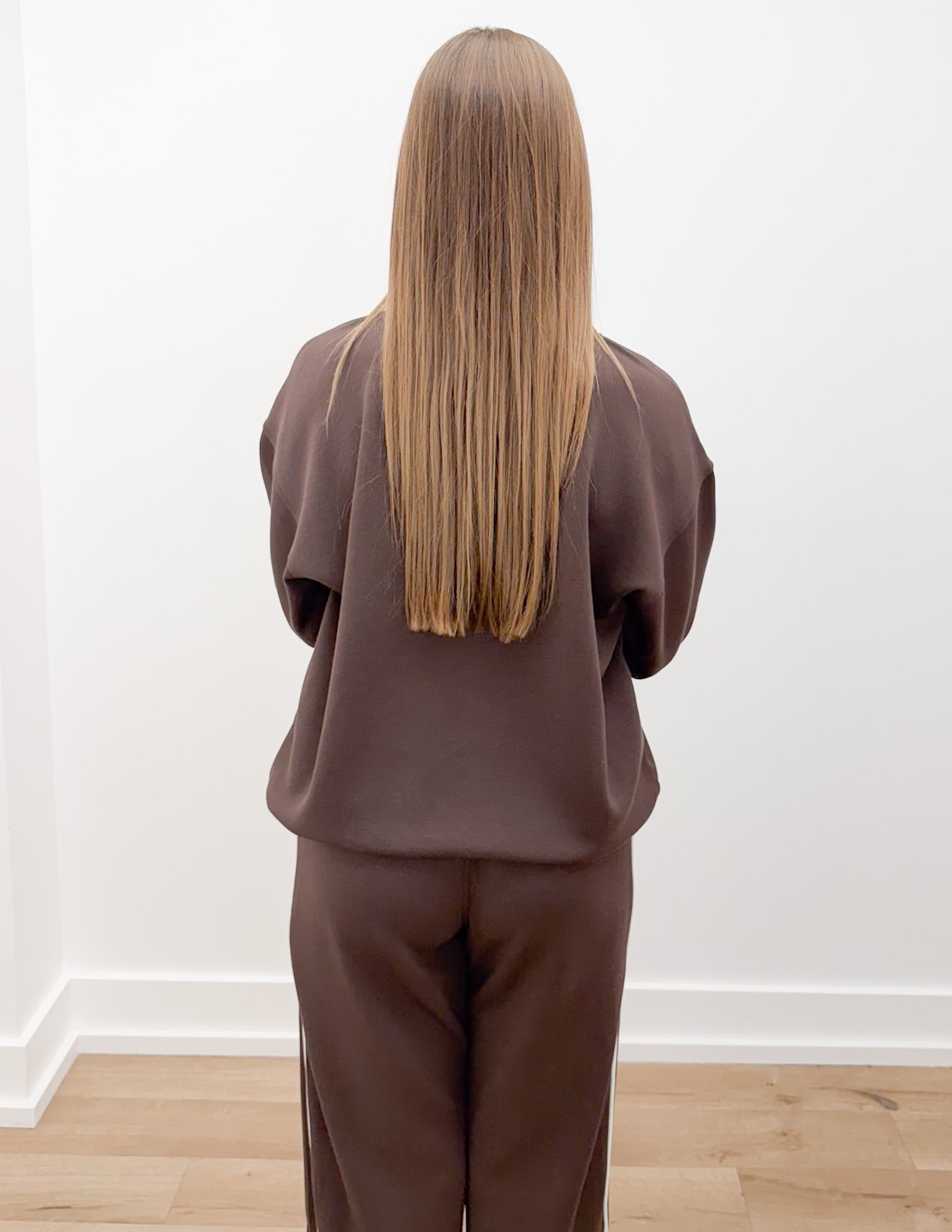 Features: - Modal poly span scuba fabric - Silky smooth and lightweight - 4-way stretch - Relaxed fit - Long sleeve top - V neck - Dropped shoulder - Piping details