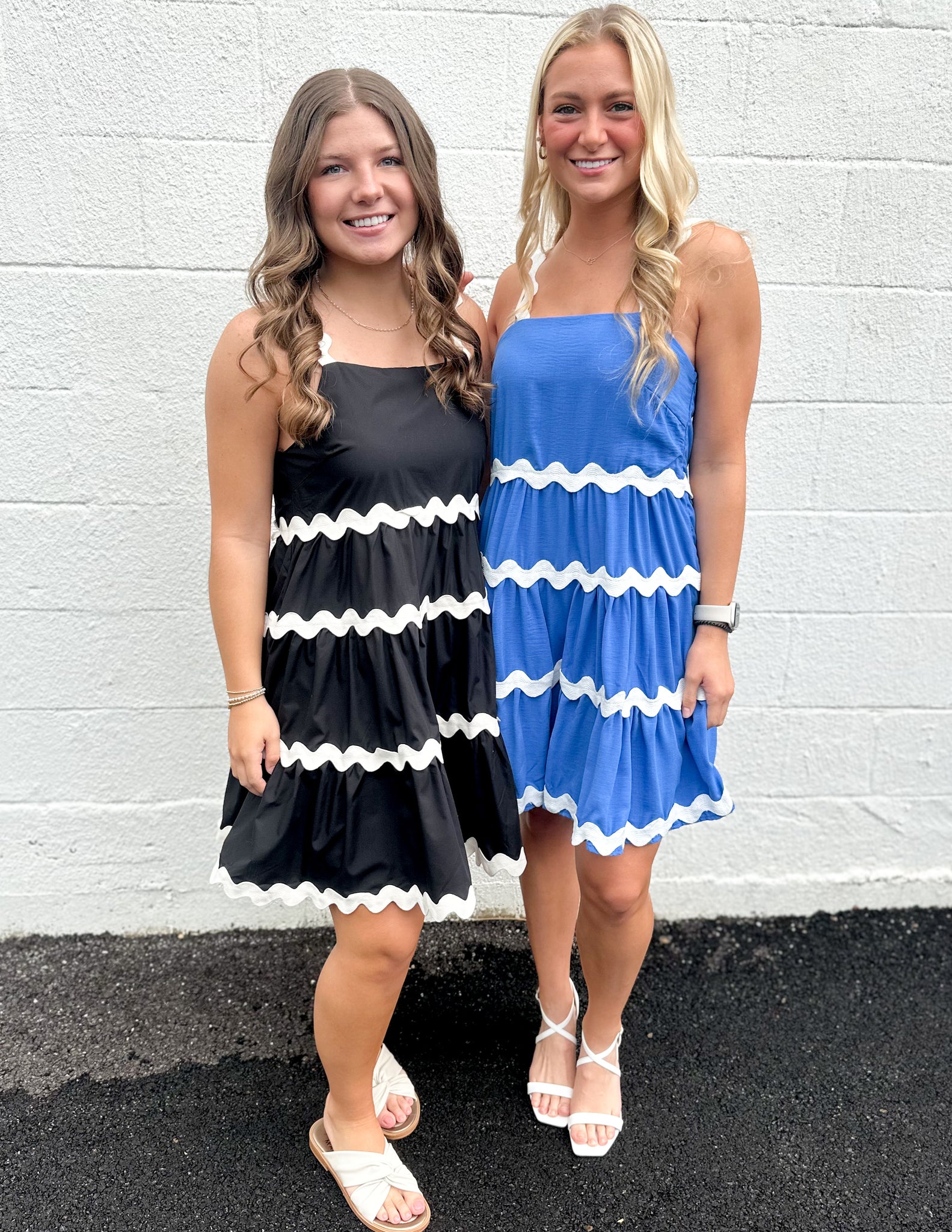 Solid square neck sleeveless mini dress featuring rick rack trimming detail. Pockets at side. Zipper closure at side. Lined. Woven. Non-sheer. Lightweight.