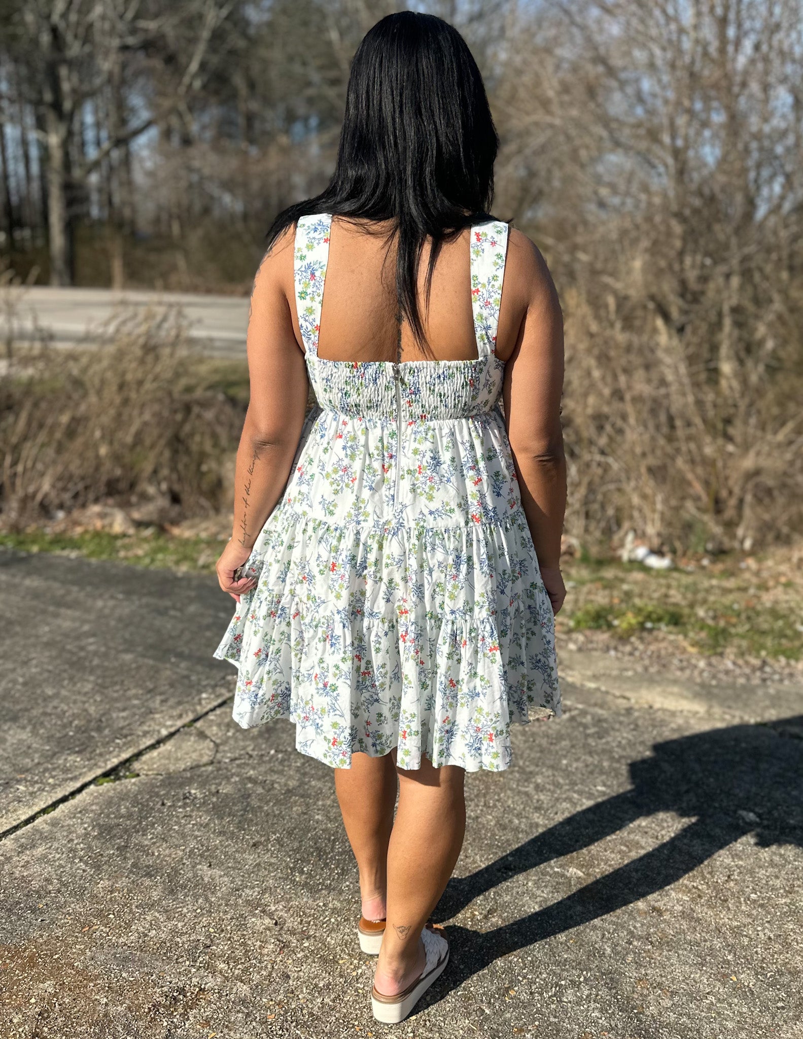 Floral print sleeveless front open keyhole self tie detail babydoll mini dress. Lining.