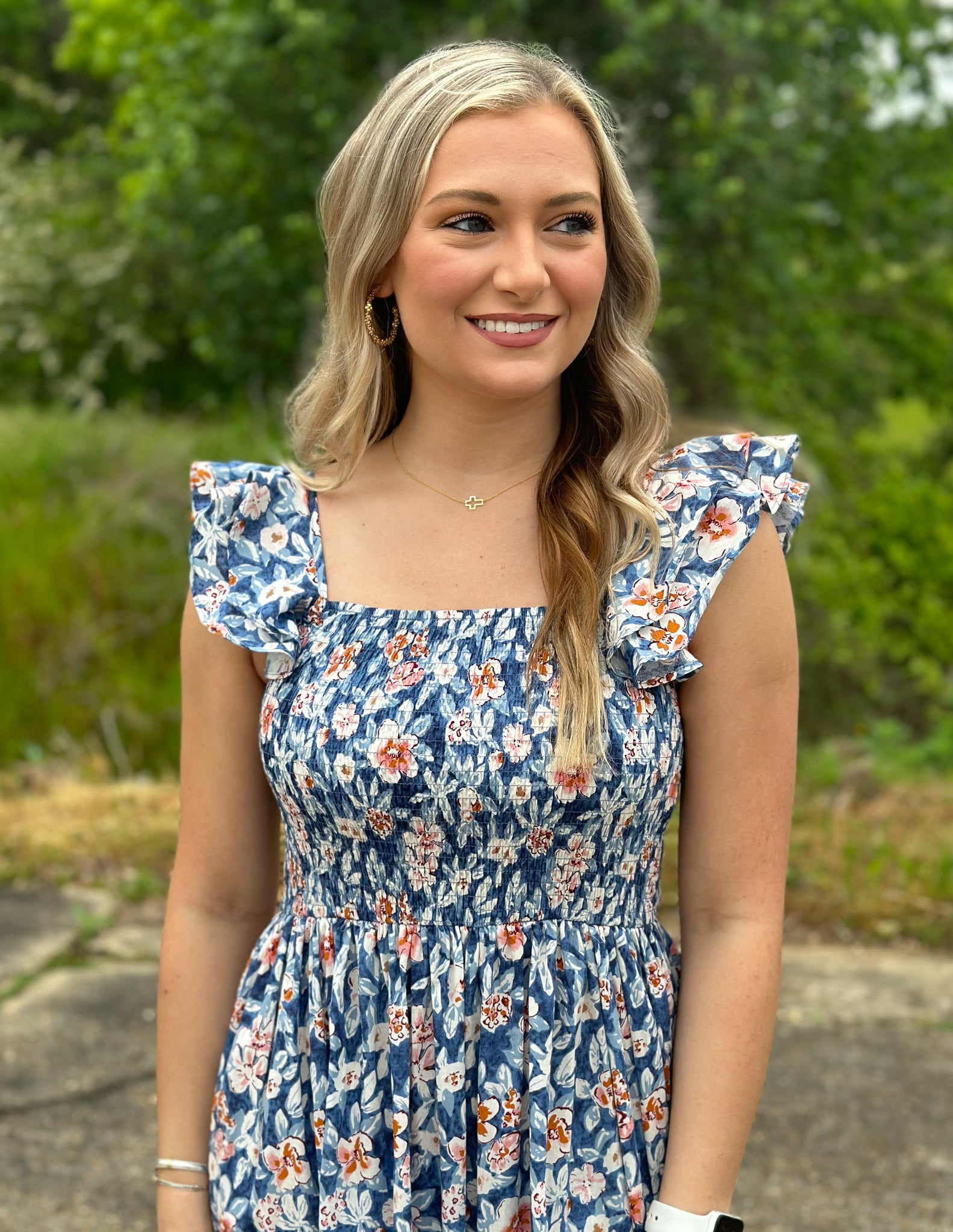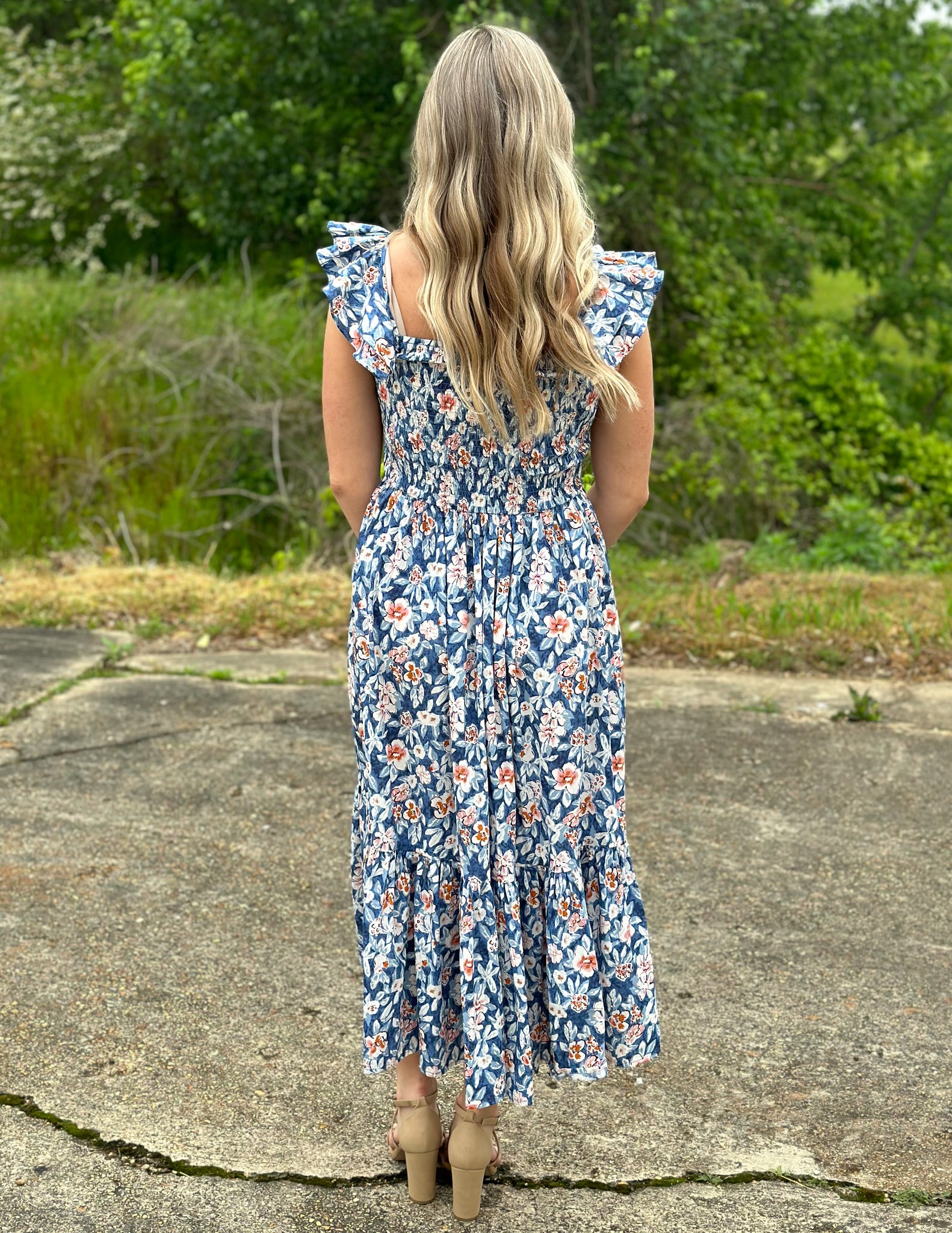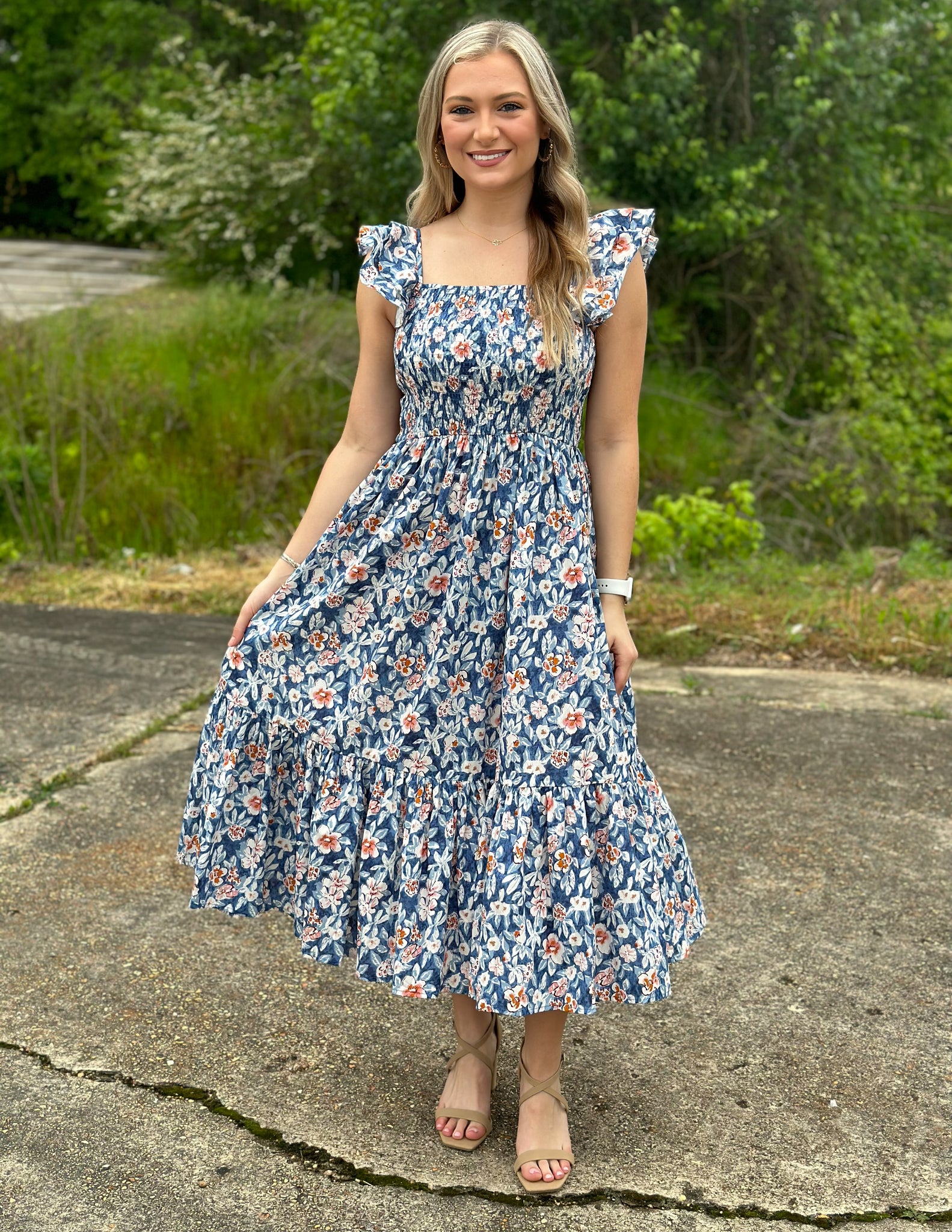 Stand out in this floral midi dress with ruffled short sleeves and a tiered hem! Model is 5'8" and wearing a small.