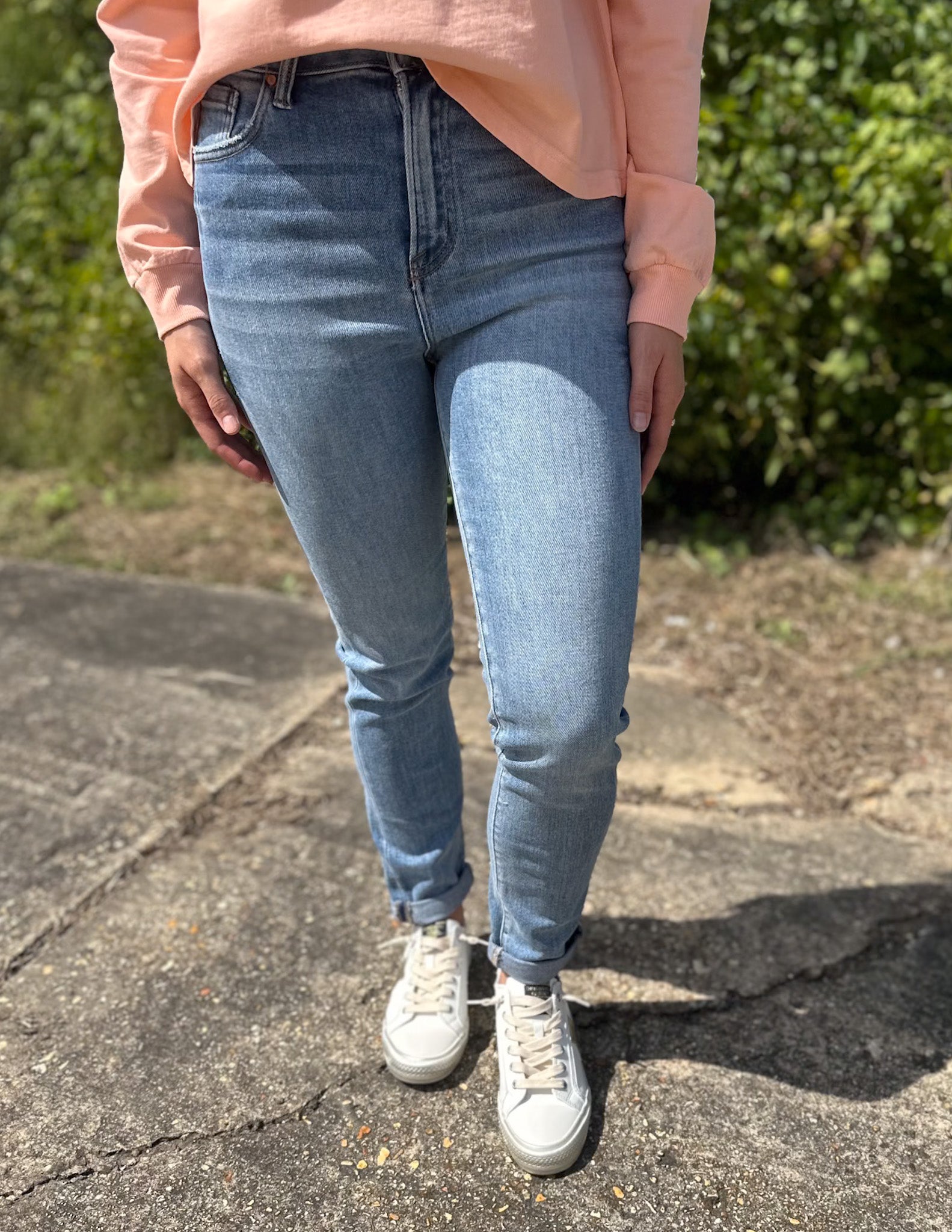 HIGH-RISE CUFFED STRAIGHT JEANS - Rise: 10" | Inseam: 28.5" in size 3/26 - Model Info: Height 5'10" | Waist 23.5" | Hips 36"