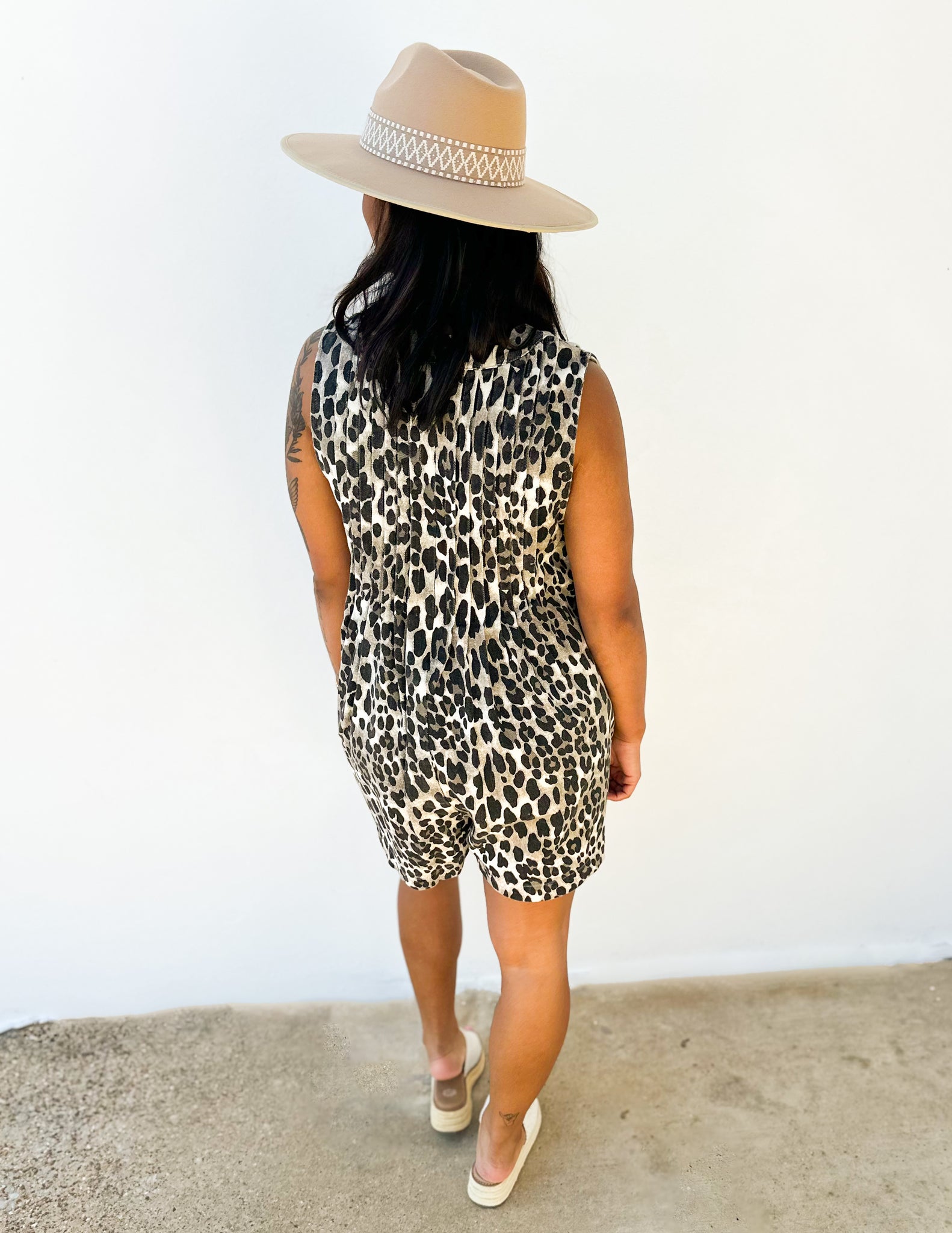 LEOPARD PATTERN PINTUCK ROMPER WITH SIDE POCKET