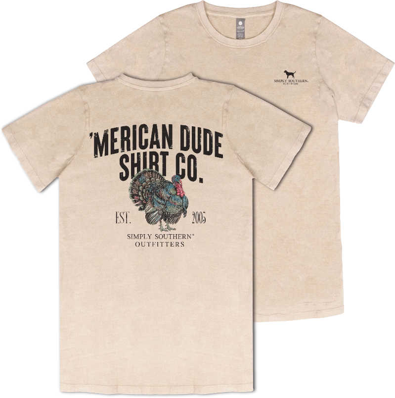 Mineral washed ecru short sleeve shirt with the phrase ''Merican dude shirt co.' and a colorful, realistic turkey. Simply Southern logo below and on left chest. 100% cotton. Unisex sizing.