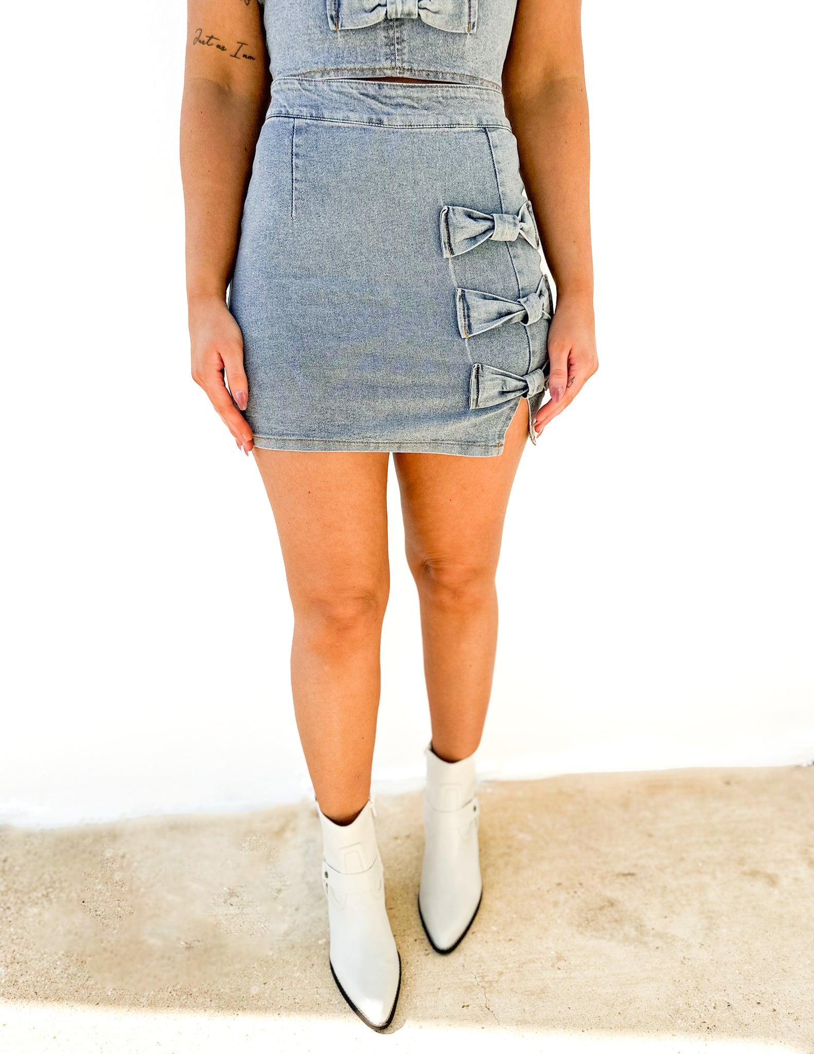 Denim Mini Skirt With Slit and Ribbon Bow Trim Detail