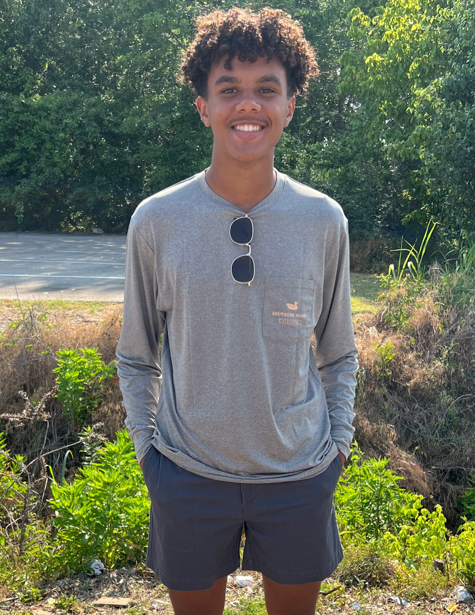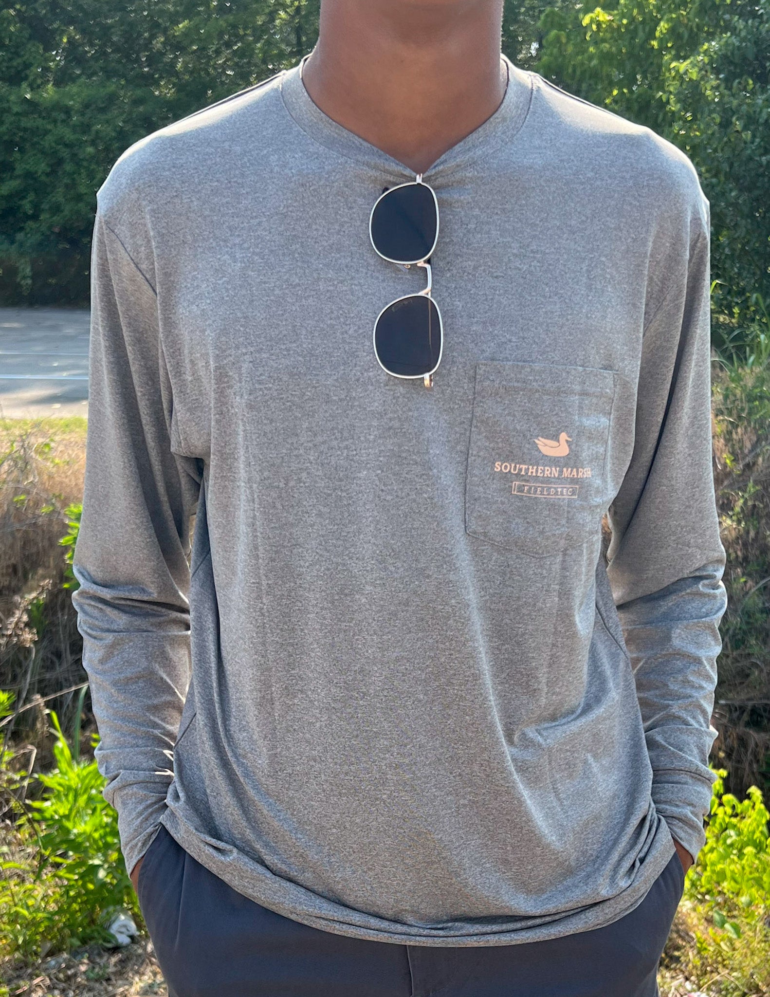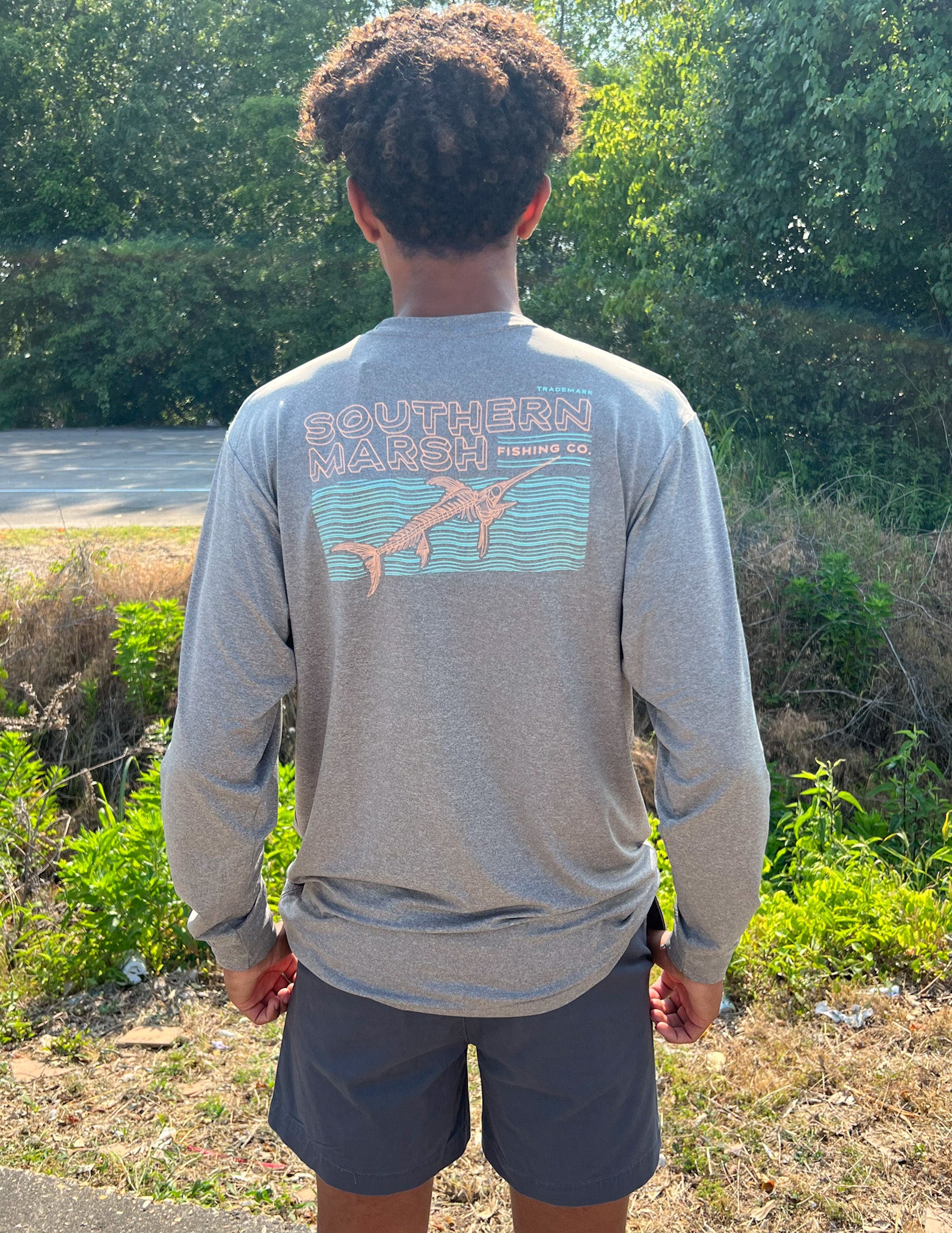 Don't find yourself out on the boat this summer without the Marlin Waves FIELDTEC™️ Featherlight long sleeve tee. Designed with outdoorsmen in mind, it’s stretchy and lightweight to keep you comfortable all day long. Finished with our signature mallard pocket print and custom lure design, it is the perfect shirt for all of your summer activities.