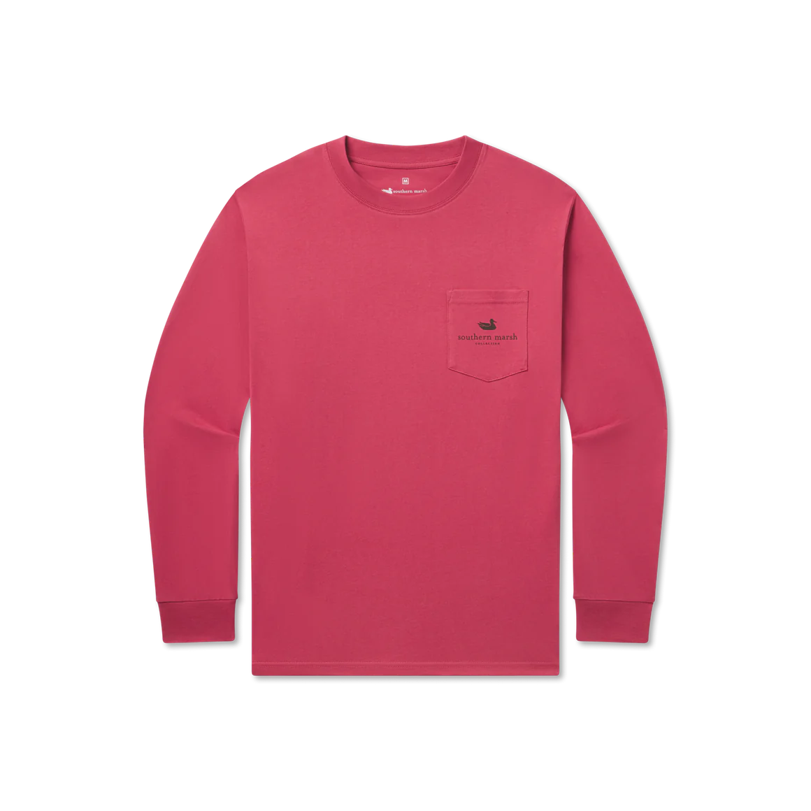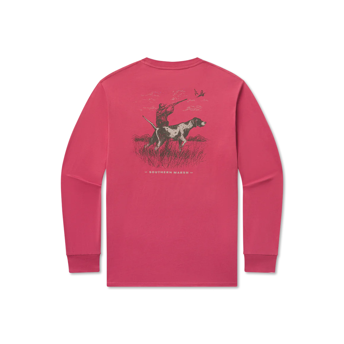 Crafted with the southern sportsman in mind, our long sleeve Pointer Uplander tee features a custom bird hunting dog and man design on the back and our classic mallard logo on the front pocket. This tee is crafted from 100% ultra soft cotton and boasts a printed neck tag for added comfort.
