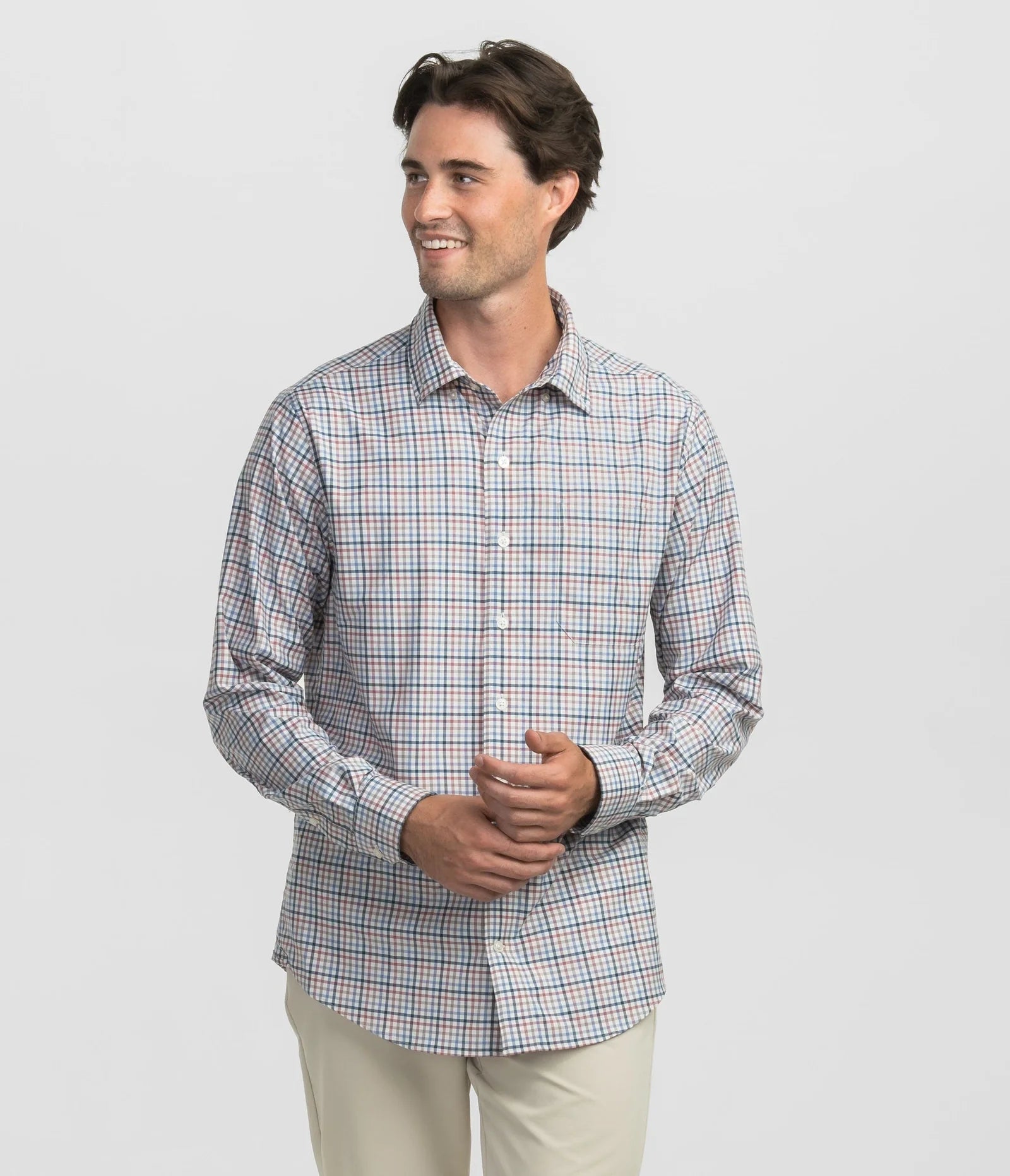 Brandon is 6’0” and is wearing a medium Samford Check in Denali.
