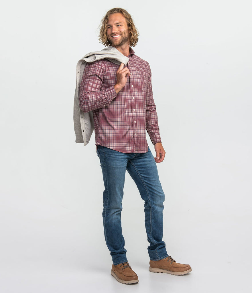 - Non-boxy, modern fit. Nylon/Spandex yarn dyed blend