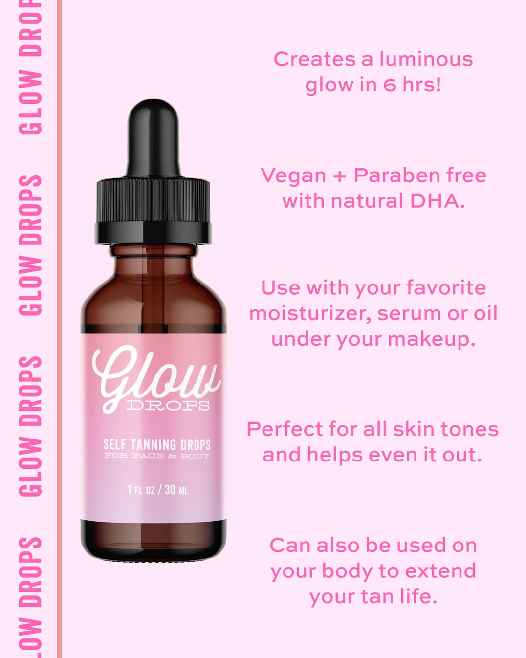 Get the ultimate golden face glow! Our self tanning drops turn your moisturizer into the perfect face (and neck/décolletage) tan. Ultra lightweight formula that dries quickly and leaves your skin feeling hydrated (and oh so glowy). To use: Add a few drops to your moisturizer in the morning. Rub your hands together and run onto your face and/or neck. Wash your hands. Leave on for 6-8 hours and watch your face glow.