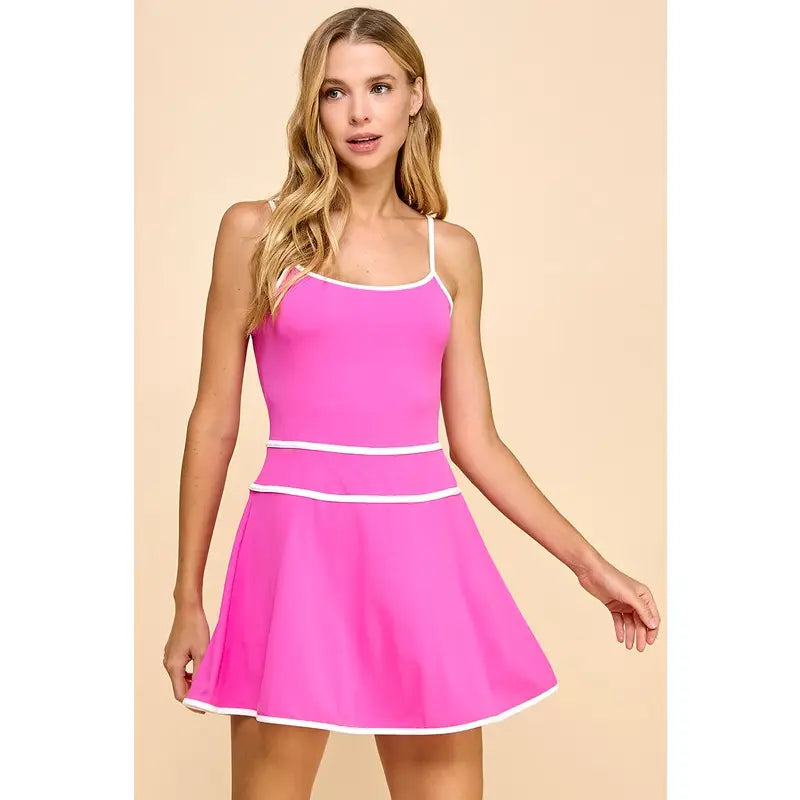 Athletic wear tank dress with contrasting white binding and flared skirt. inner shorts attached. Lined.