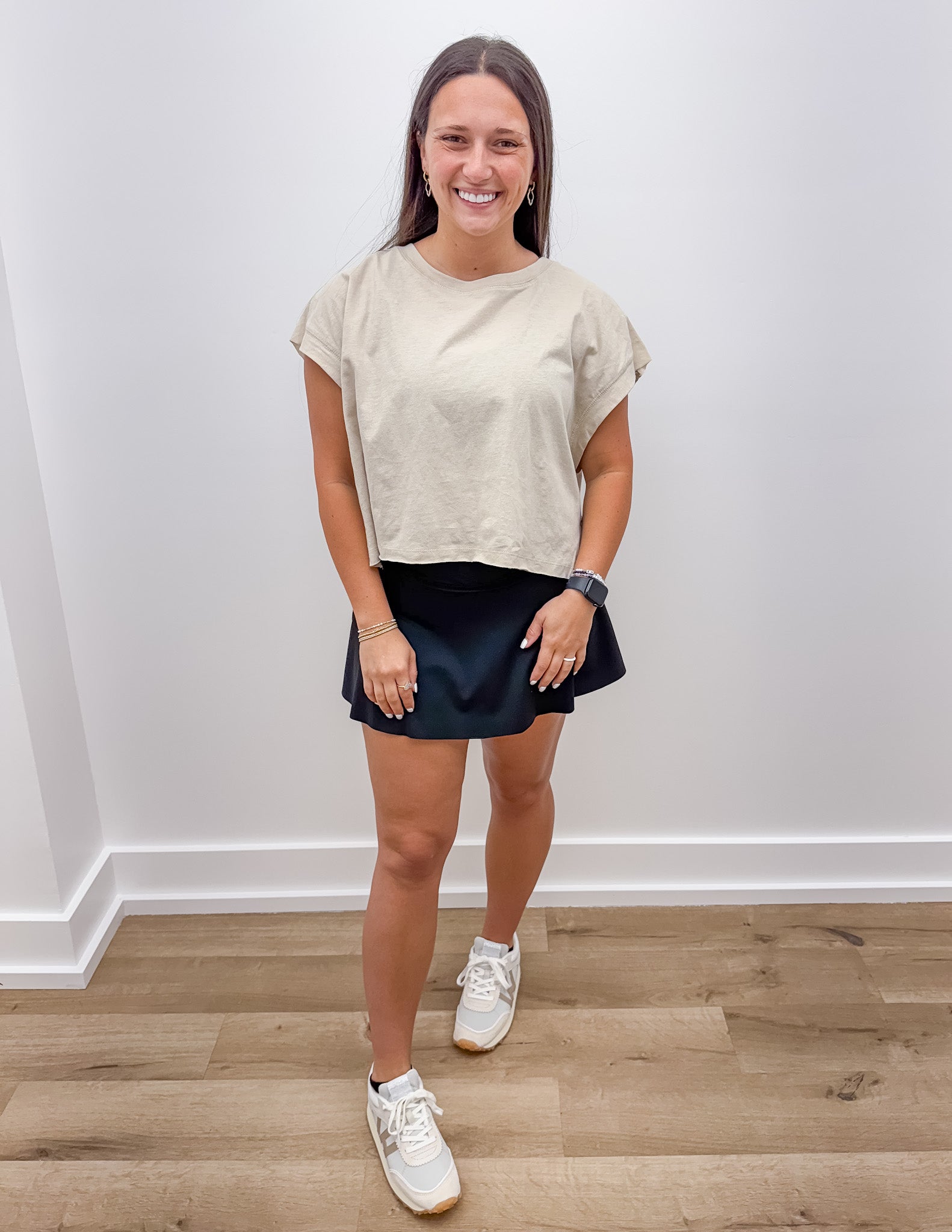look for any occasion. Features: - Breathable and lightweight cotton slub fabric - Relaxed fit / Oversized - Cropped length - Wide round neckline - Short sleeve tee - Dropped armhole - Open back - Raw edge details