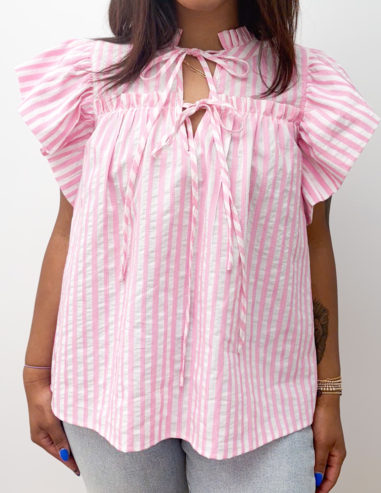 JACQUARD STRIPE WOVEN RUFFLED SLEEVES FRONT BOW TOP